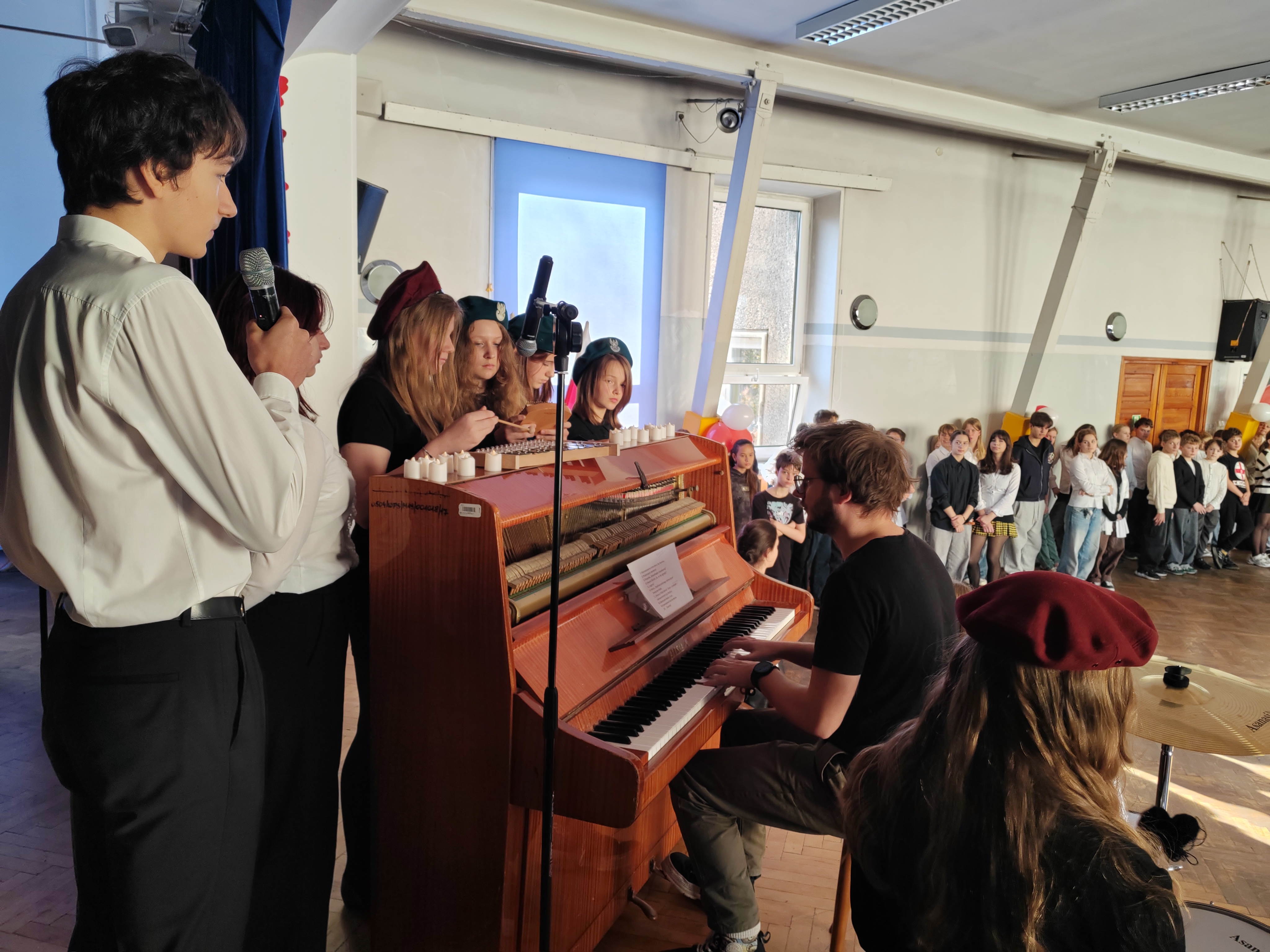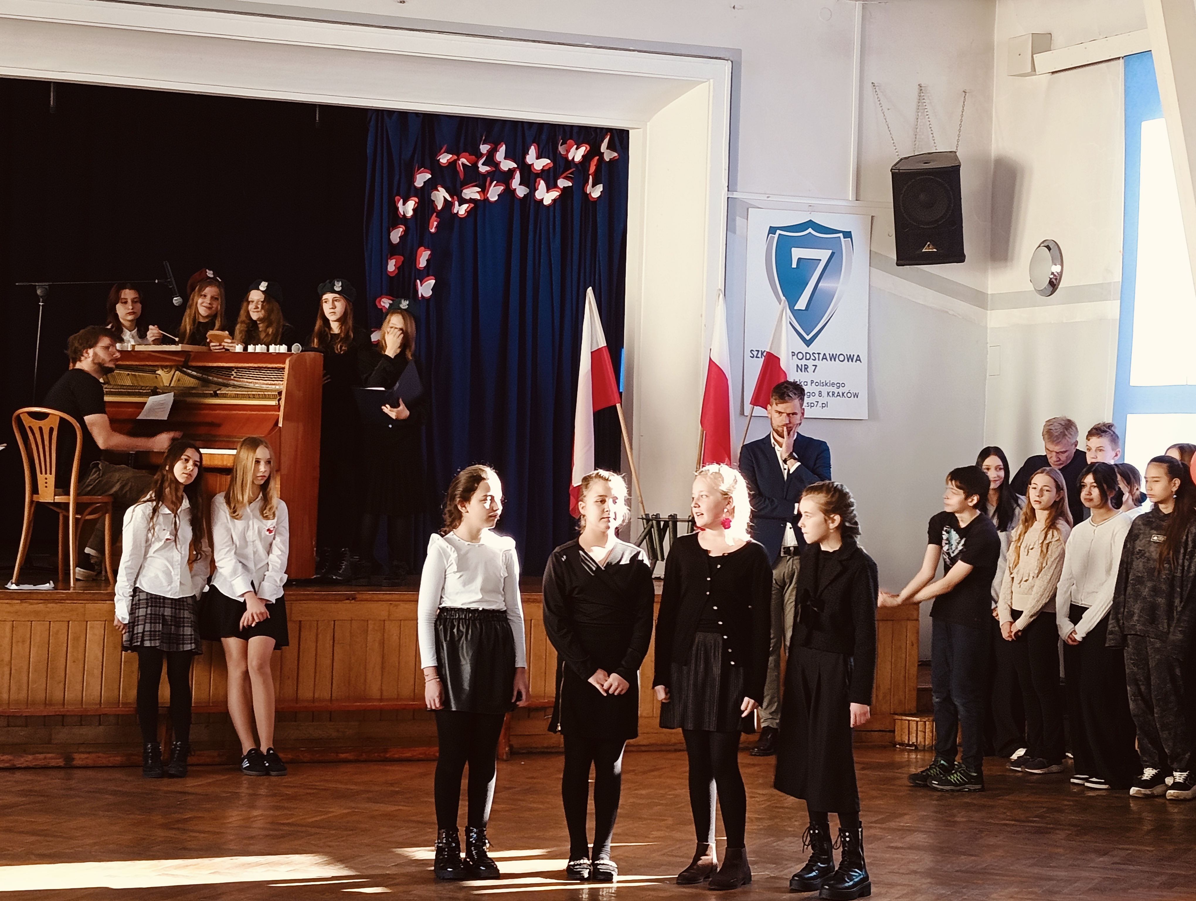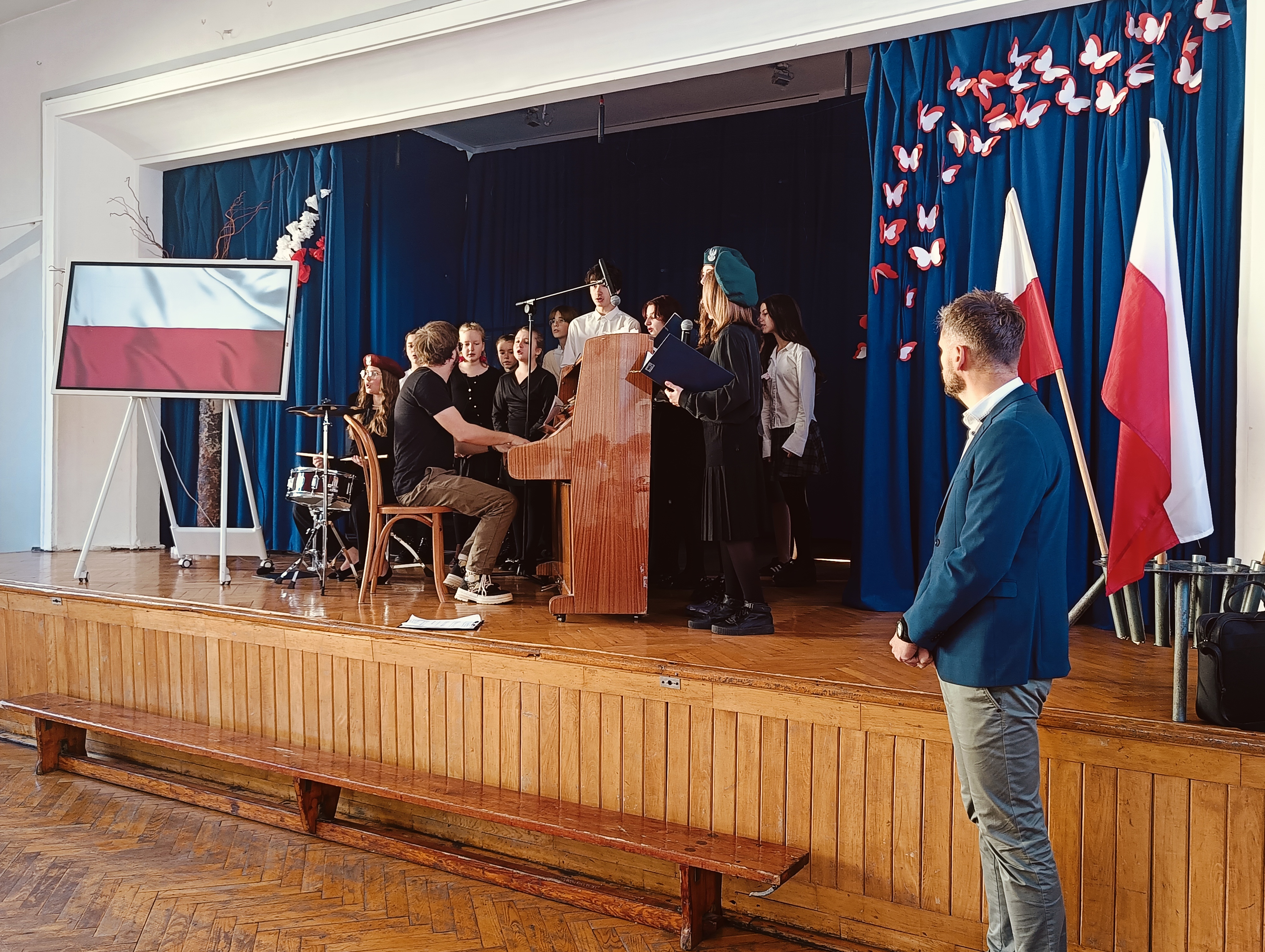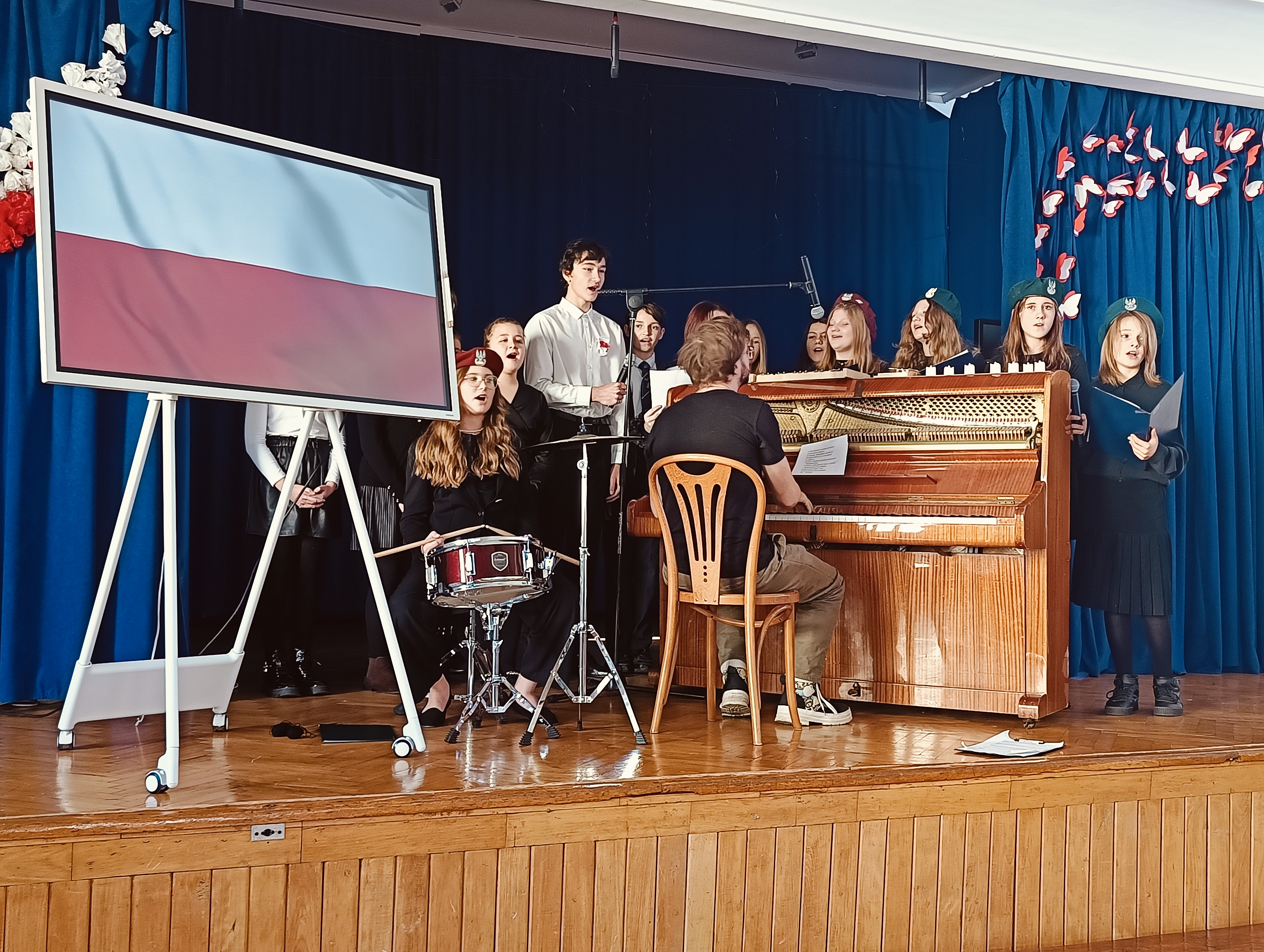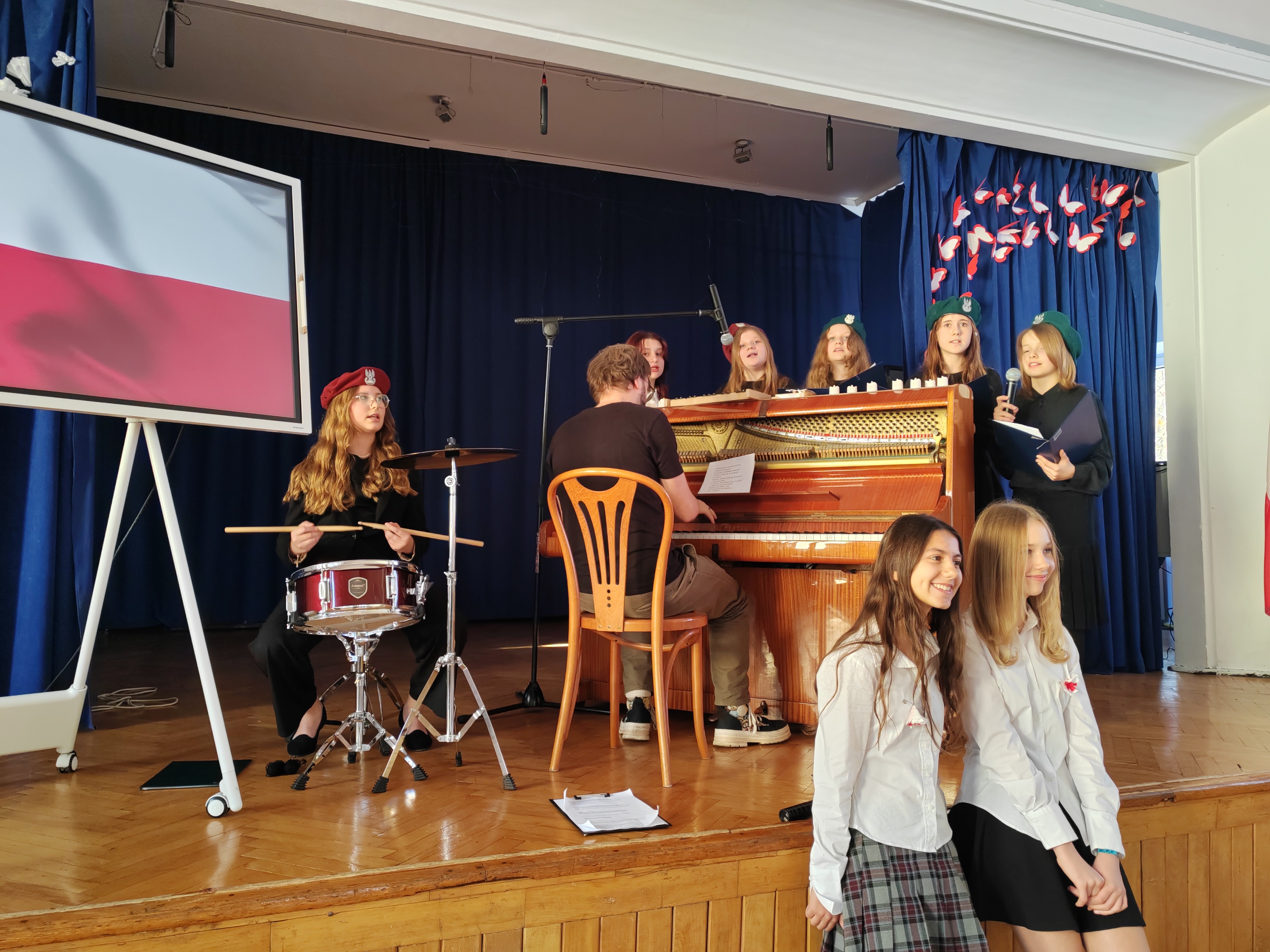 Na tle biało-czerwonych dekoracji uczniowie z dumą opowiadali o historii naszego kraju, oddając hołd bohaterom narodowym. Całość uroczystości zakończyło wspólne wykonanie pieśni „Piechota”, która dźwięcznie i radośnie rozbrzmiała w sali, niosąc przesłanie odwagi i siły polskiego żołnierza.