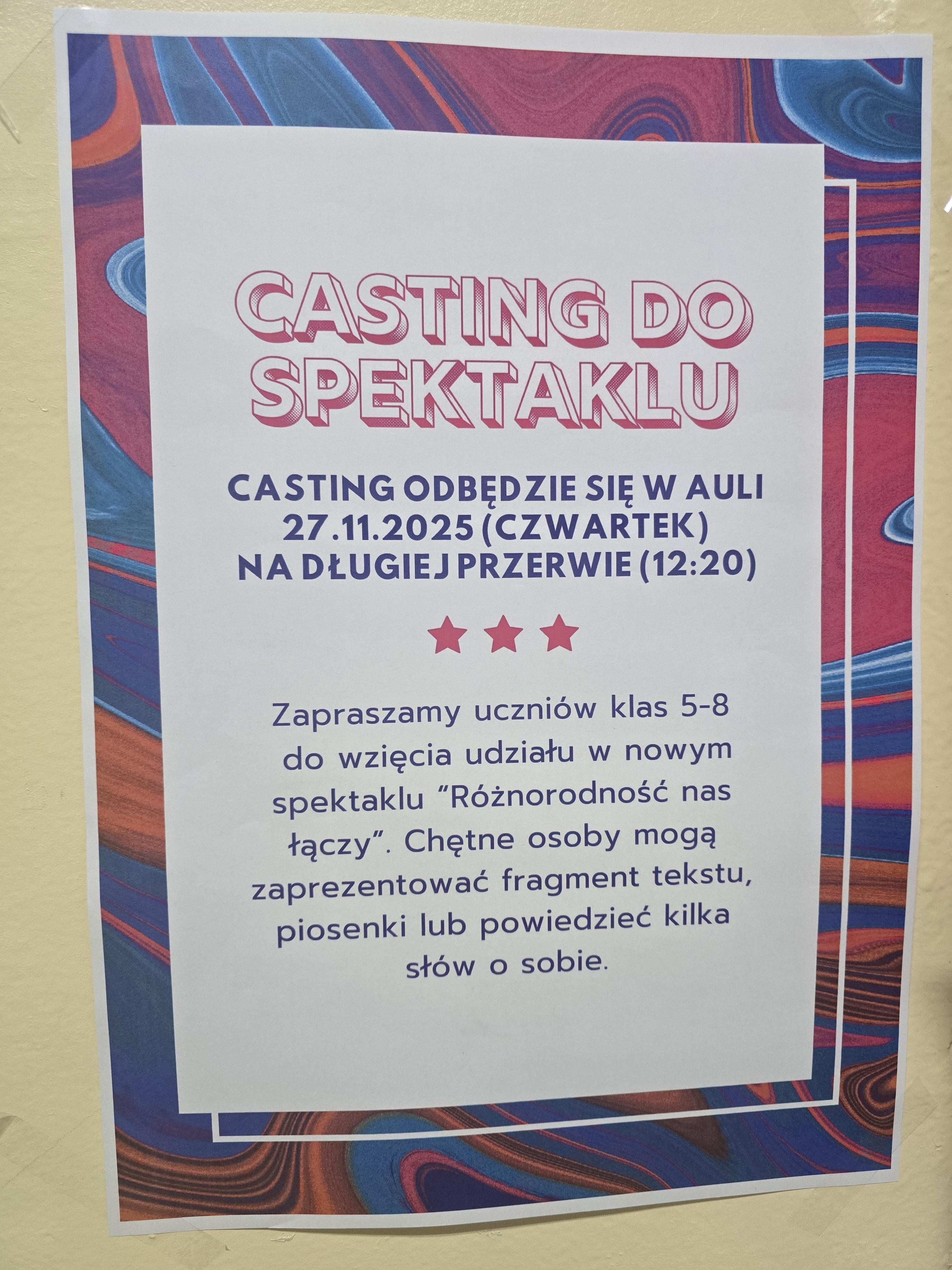 Czwartkowa przerwa obiadowa obfitowała w wielkie emocje i prawdziwą ekscytację. Pod aulą zgromadzili się uczniowie i uczennice marzący o karierze scenicznej. A żeby taką karierę rozpocząć, jest niemała szansa, bowiem nasza szkoła organizuje spektakl (tytuł i miejsce jego wystawienia są jeszcze objęte tajemnicą).