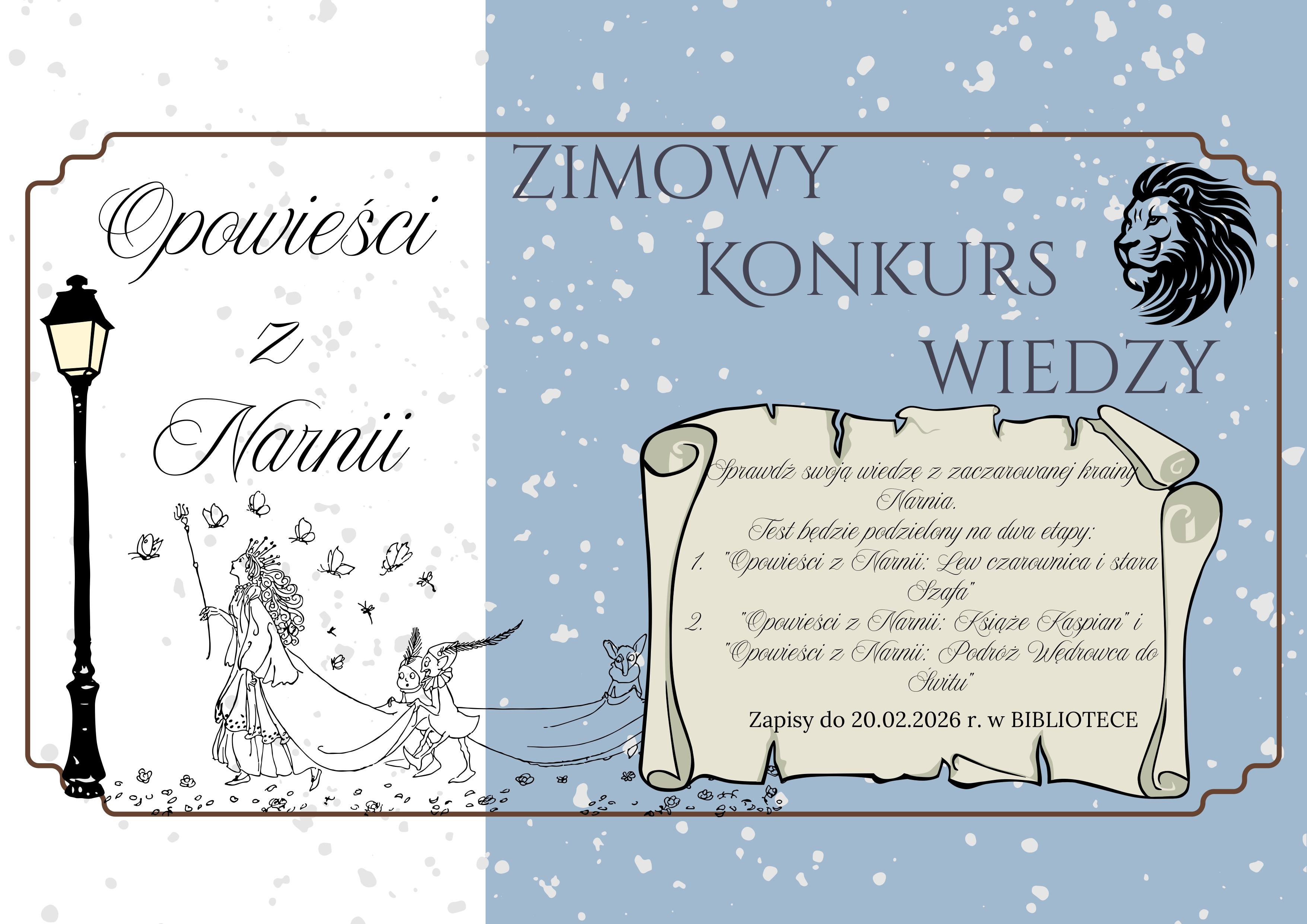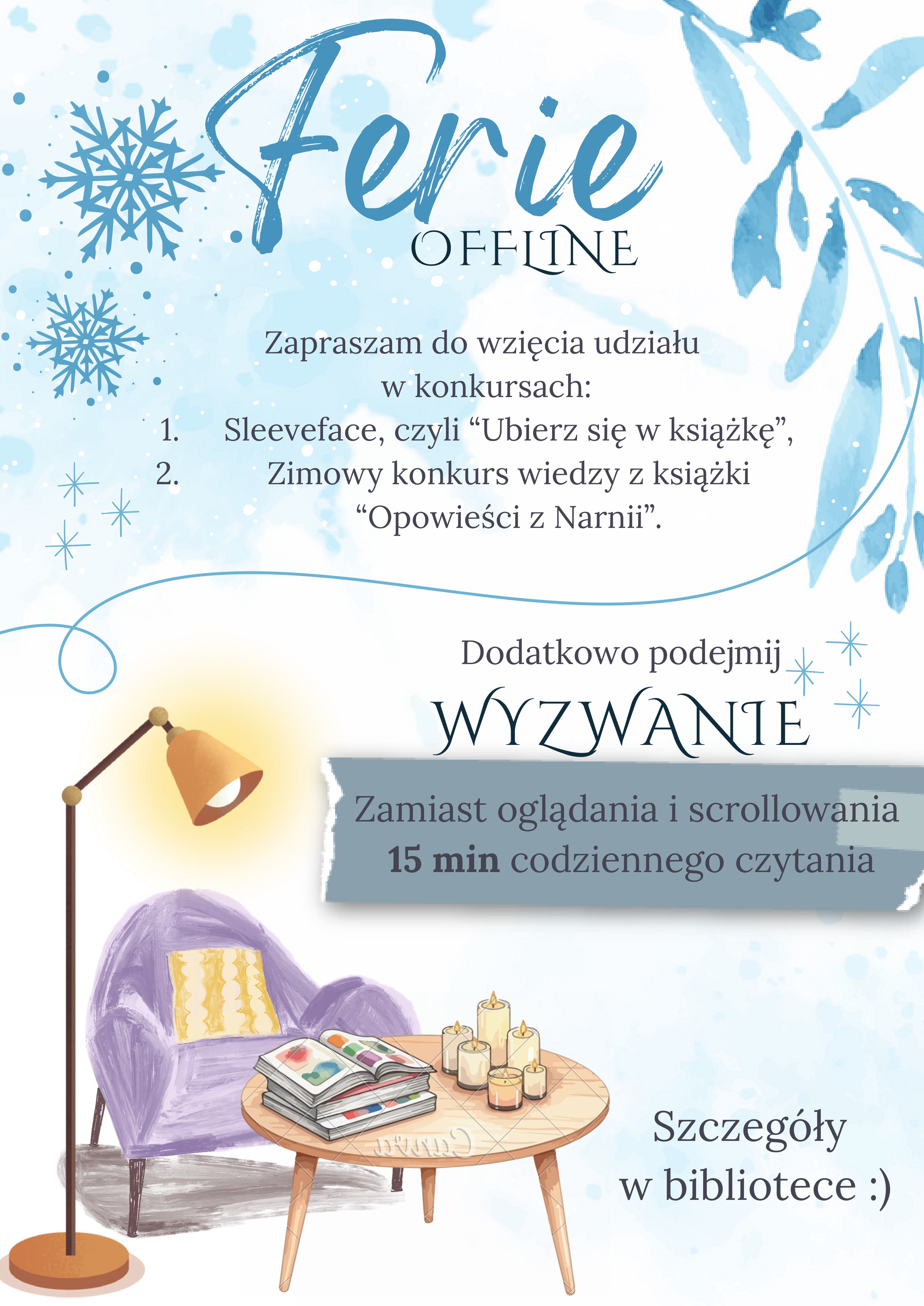 Zapraszam do wzięcia udział w Ferie Ofline. Podejmij wyzwanie "Zamiast oglądania i scrollowania 15 min codziennego czytania". Szczegóły w bibliotece. Dla wytrwałych czekają nagrody :) Oprócz wyzwania zachęcam do wzięcia udziału w dwóch konkursach: 1. Sleeveface, czyli "Ubierz się w książkę", 2. Zimowy konkurs wiedzy z książki "Opowieści z Narnii".