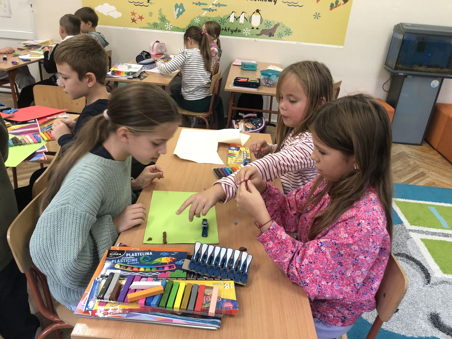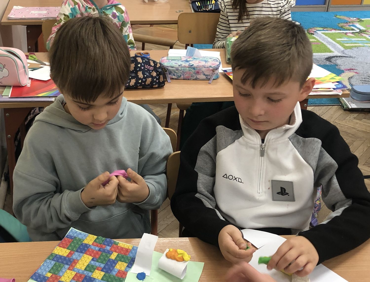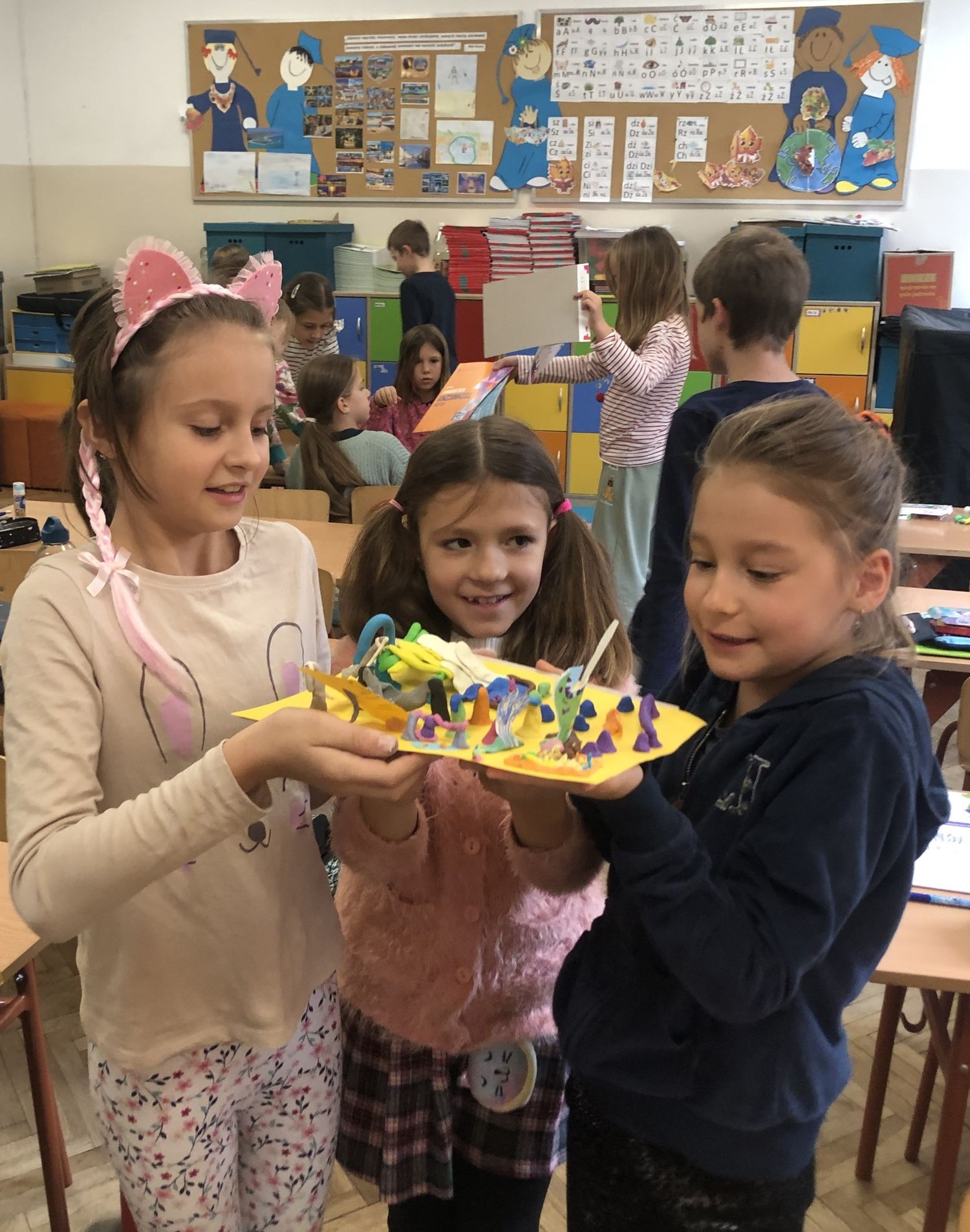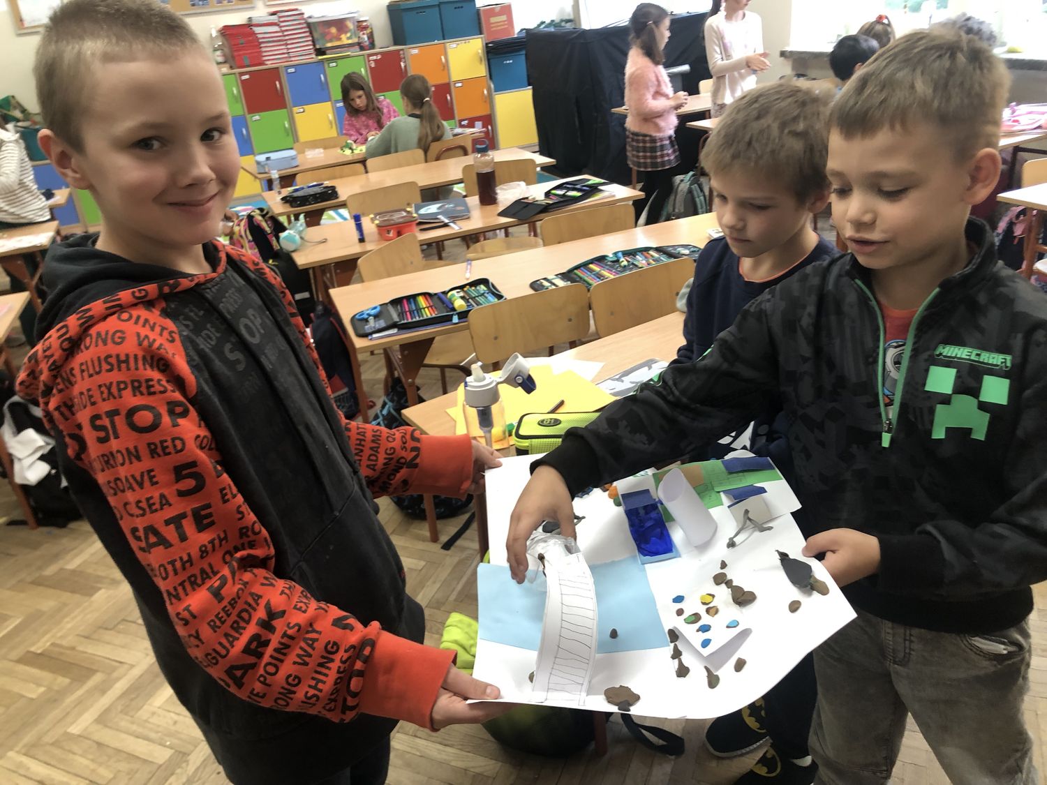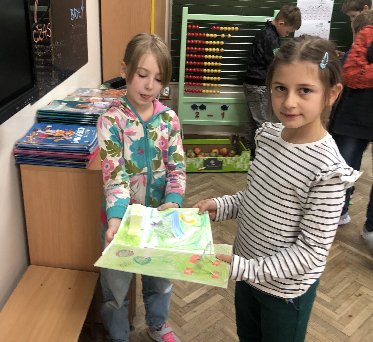 W dniach 15-17 października dzieci z klasy II b zrealizowały I moduł projektu matematycznego „Natalka i Antek w Świecie Wielkiej Matematyki”. Na pobliskim placu zabaw wytropiły: koła, kwadraty, prostokąty, a nawet pięciokąt! W elementach ogrodzeń, ławek, bramy: półkule, stożki, prostopadłościany i walce! Policzyły siebie, ilość płytek chodnikowych, ilość przyrządów na placu, koszy na śmieci i siedzisk. Wyznaczyły czas oczekiwania w kolejce do trampolin! A w szkole… w szkole obliczyły obwód prostokąta, rozdzieliły dzieci na karuzeli, narysowały, a potem skonstruowały swoje własne place zabaw: z papieru, śmieci znalezionych na podłodze, plasteliny. Okazało się, że matematyki na placu zabaw jest bardzo dużo. Trzeba tylko uważnie się przyglądać!