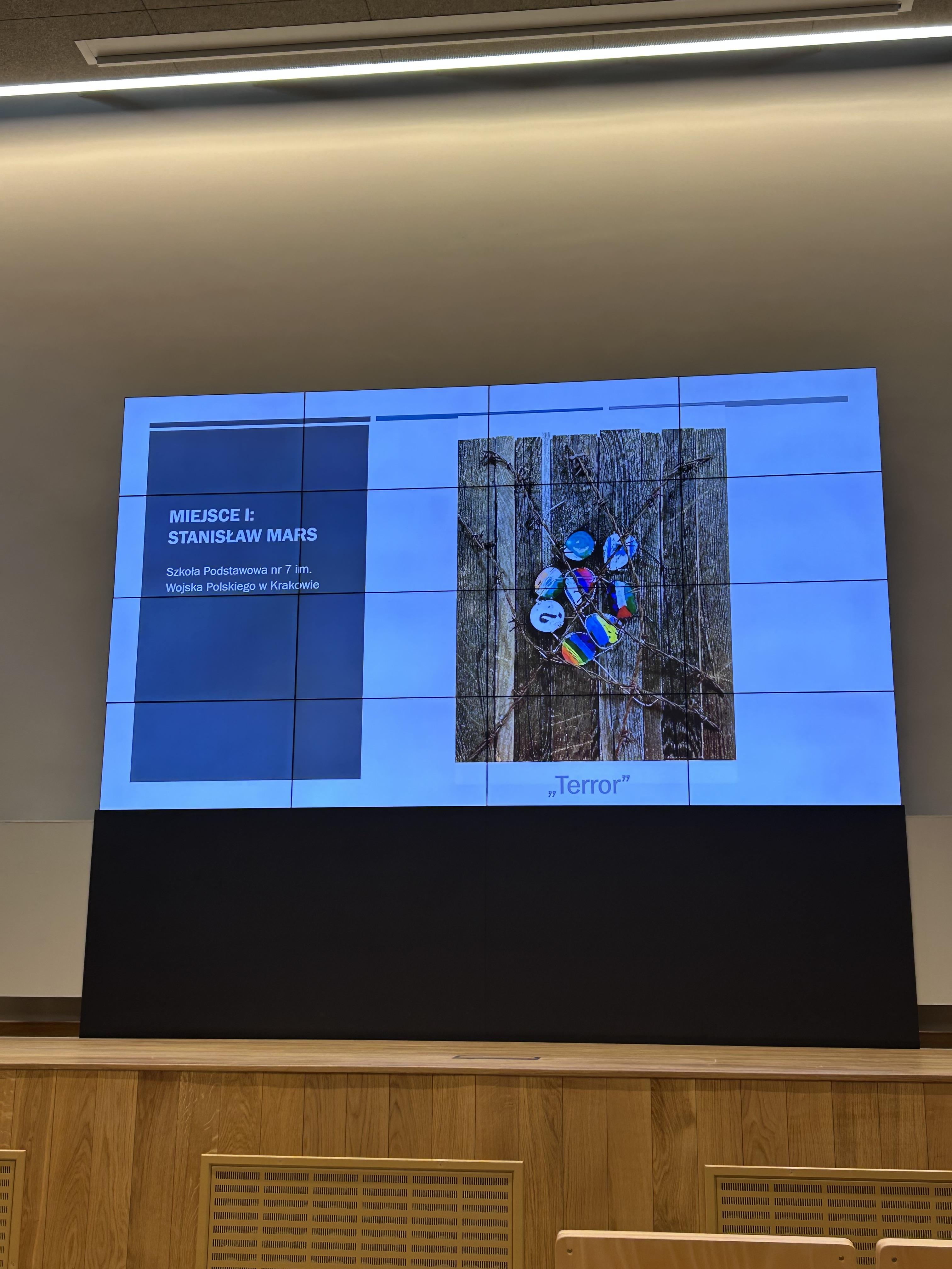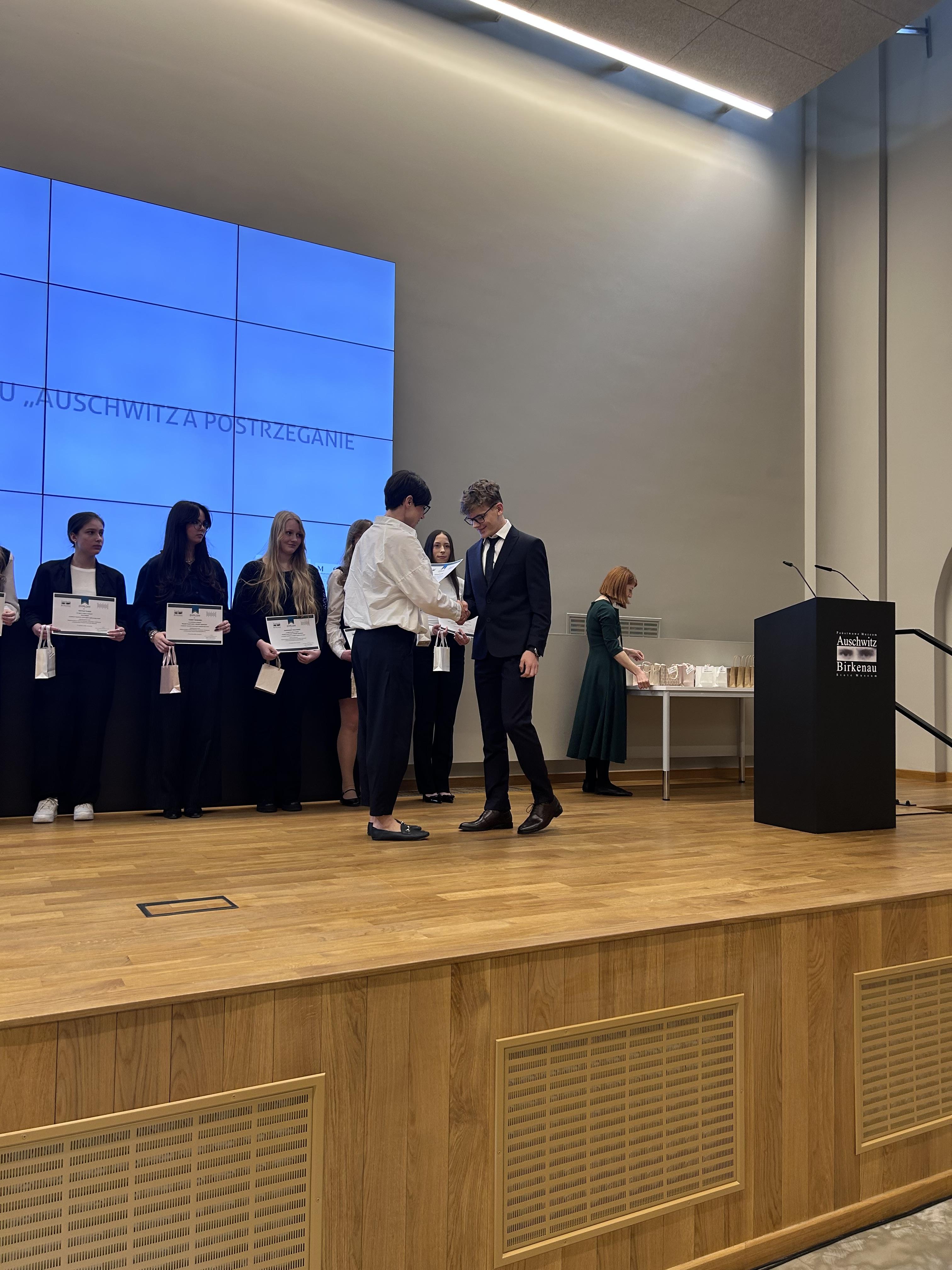 Uczeń klasy 8a, Stanisław, został laureatem ogólnopolskiego konkursu „Auschwitz a postrzeganie współczesnego świata”. Otrzymał nagrodę za zdobycie I miejsca w kategorii plastycznej. Pracą Stasia jest wyjątkowym połączeniem pomysłowości i głębokiego przesłania o tym, że pomimo upływu tylu lat od II wojny światowej, są na Ziemi miejsca, gdzie łamane są prawa człowieka. To wyjątkowa lekcja o szacunku i pamięci historycznej, a wykonanie pracy z desek ze stodoły dziadka Stasia, która pamięta tamte czasy, dodatkowo podkreśla walory artystyczne projektu naszego ucznia. Zwieńczeniem spotkania na terenie obozu Auschwitz Birkenau było spotkanie z Panią Zdzisławą, która była więźniem obozu od 1944.