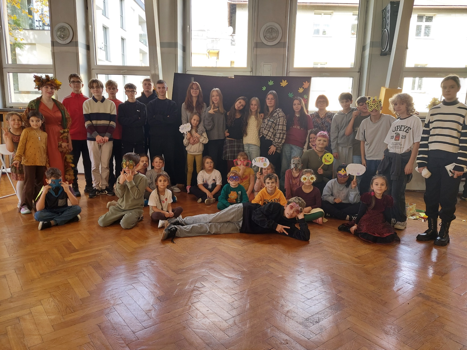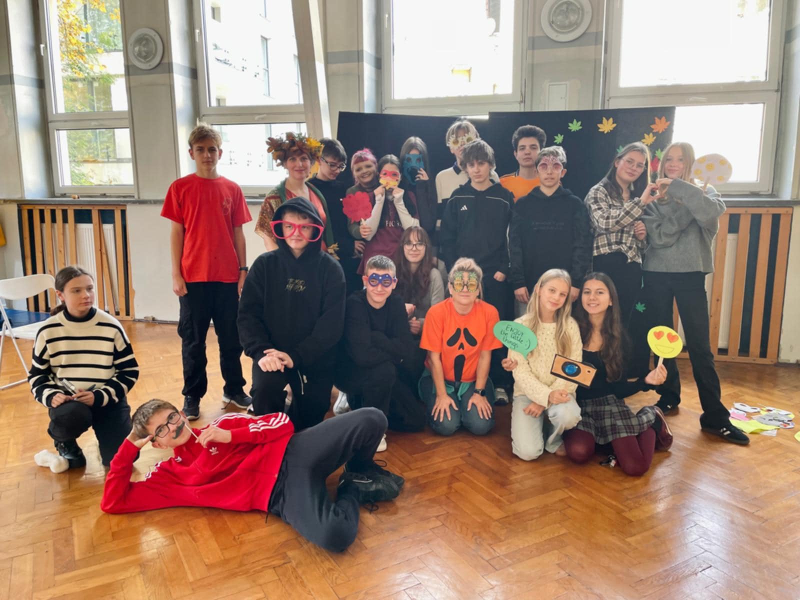 Po intensywnym przedpołudniu wszyscy spotkali się ponownie na auli. Uczniowie klasy 8b przygotowali występ „Lista przebojów jesiennych”, który wprowadził wszystkich w znakomity nastrój. Nie zabrakło również fotobudki, przy której powstało wiele pamiątkowych zdjęć pełnych uśmiechu.