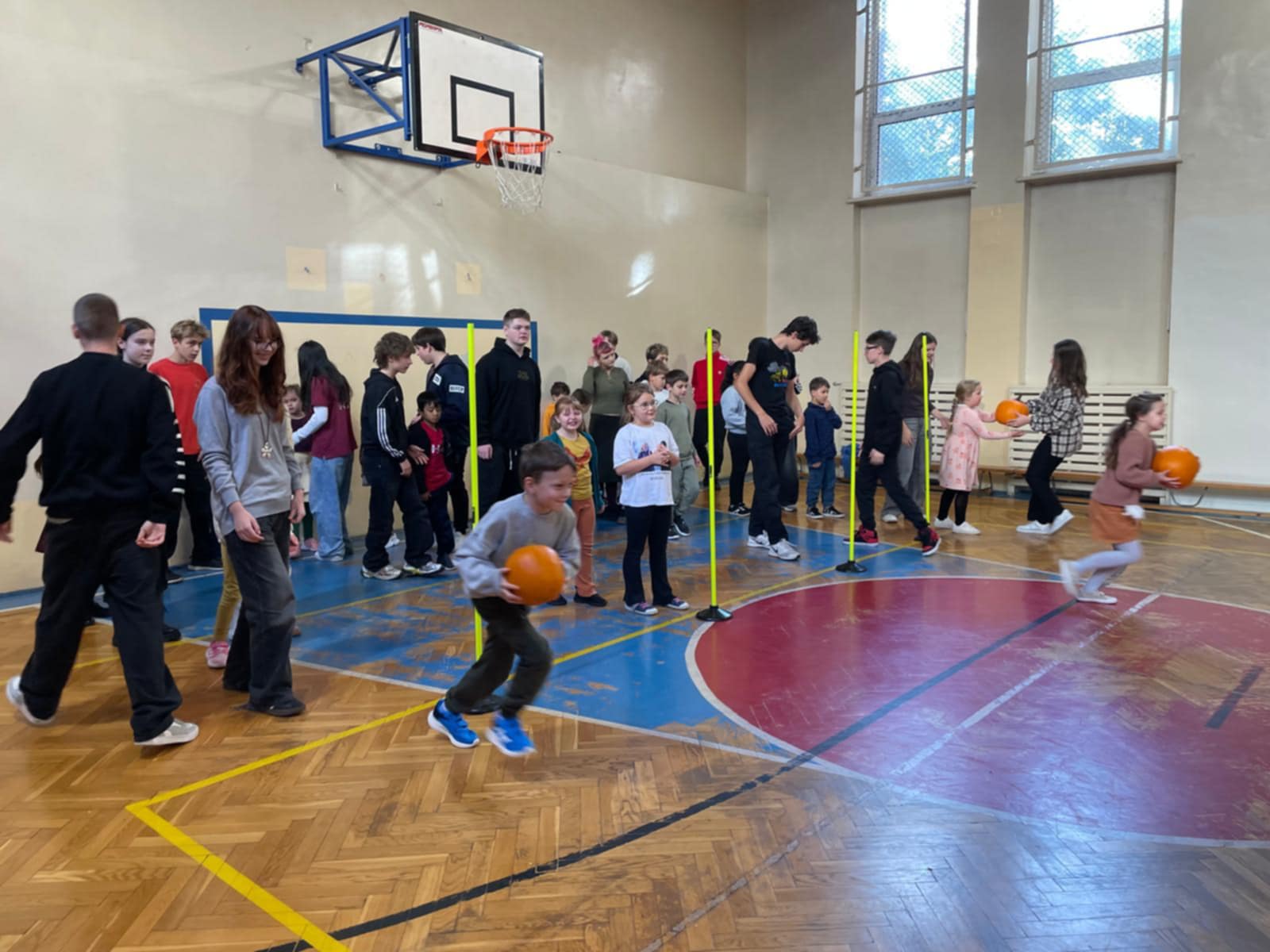 W sali gimnastycznej odbywały się wyścigi rzędów z darami jesieni, pełne emocji i śmiechu.