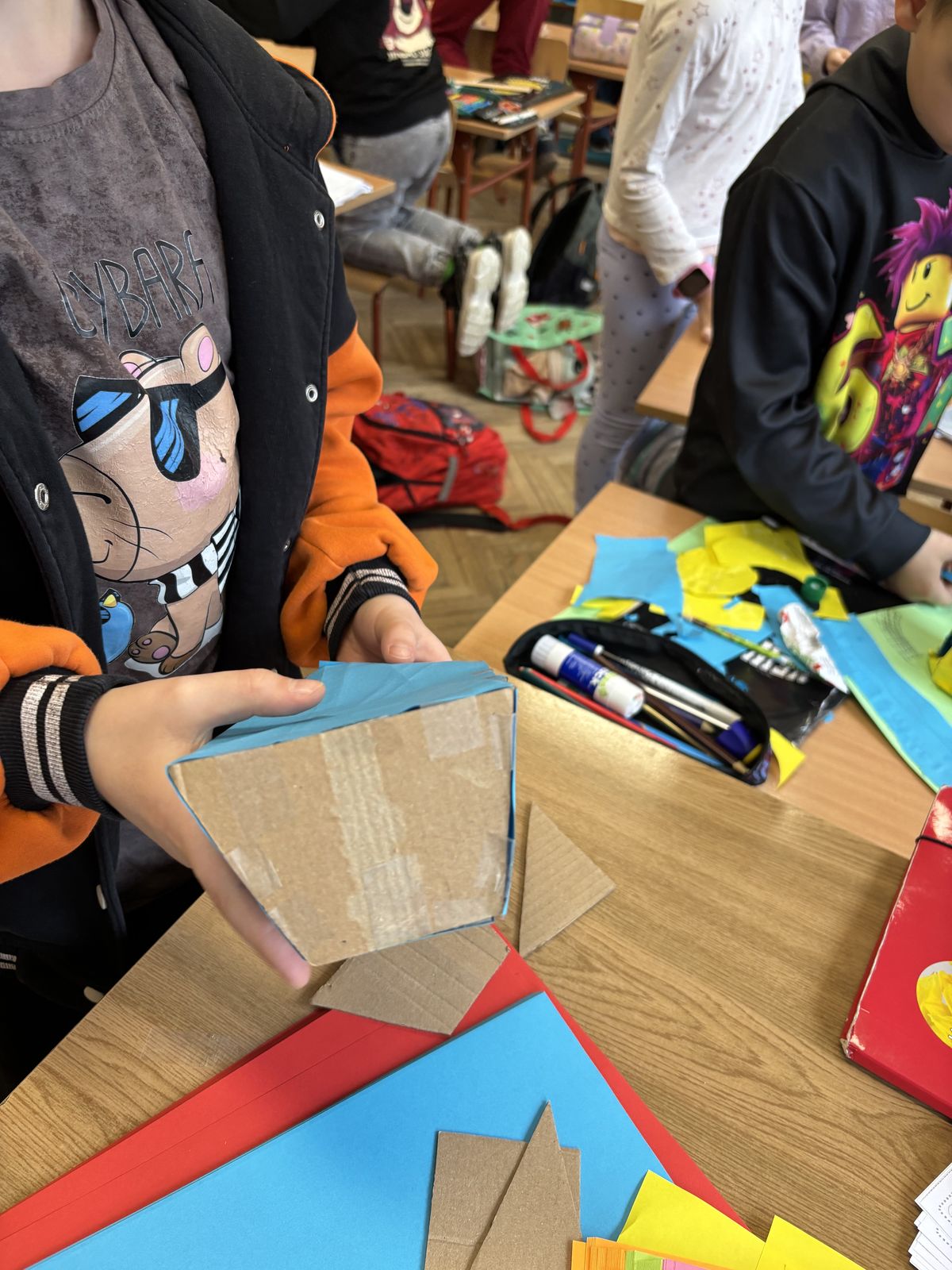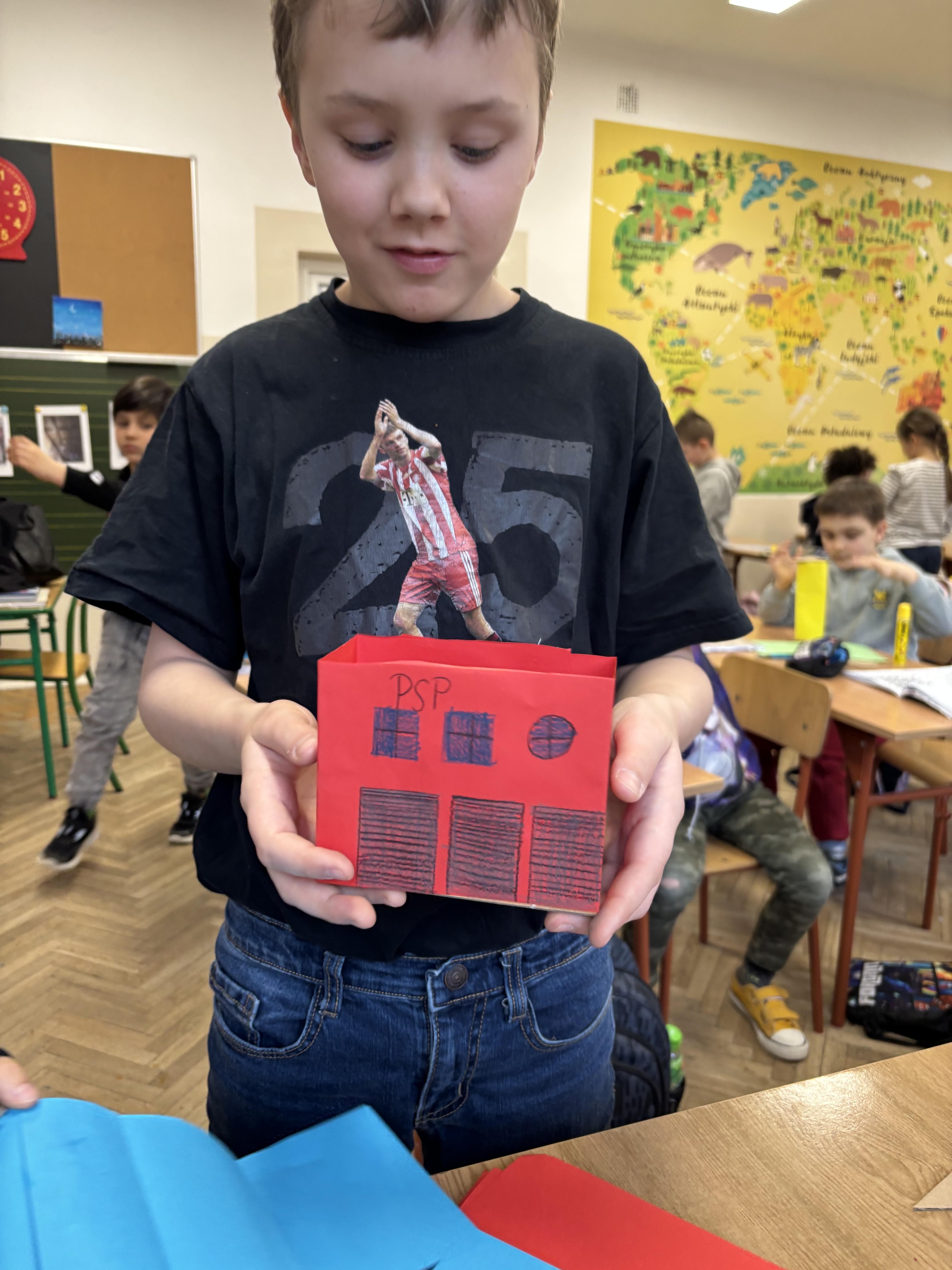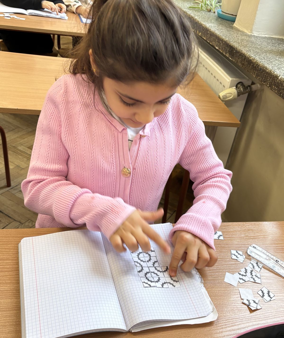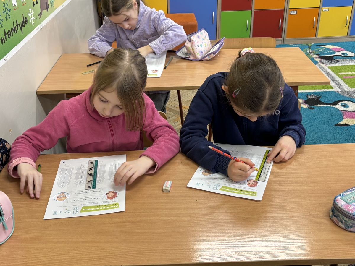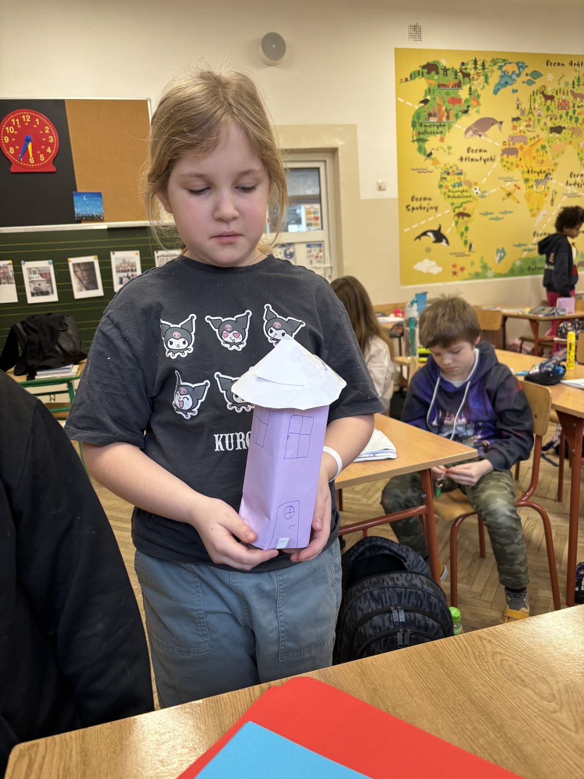 25 lutego dzieci z klasy II b zakończyły realizację kolejnego modułu projektu „Natalka i Antek w świecie Wielkiej Matematyki”. Tym razem w roli głównej wystąpiła architektura! W napotkanych podczas spaceru budowlach, uczniowie odkrywali różne bryły i kształty, powtarzające się na elewacjach płaskorzeźby i trójkątne tympanony, a na suficie w kinie, przepiękne drewniane kasetony. W klasie, dzieci wyznaczały oś symetrii budynków, a z małych papierowych kafelków, układały różnorodne parkietaże czyli mające zastosowanie na podłogach i ścianach powtarzające się, geometryczne wzory. Na planie koła, trójkąta, rozmaitych czworokątów i ośmiokąta skonstruowały własne budowle. Początki nie były łatwe, bo papier nie chciał dopasować się do podstawy. Ale w miarę upływu czasu, zaangażowanie i doświadczenie rosły, a upór, determinacja oraz wzajemna pomoc pozwoliły na ukończenie projektów. Spodobało się! Cztery osoby chcą zostać architektami!