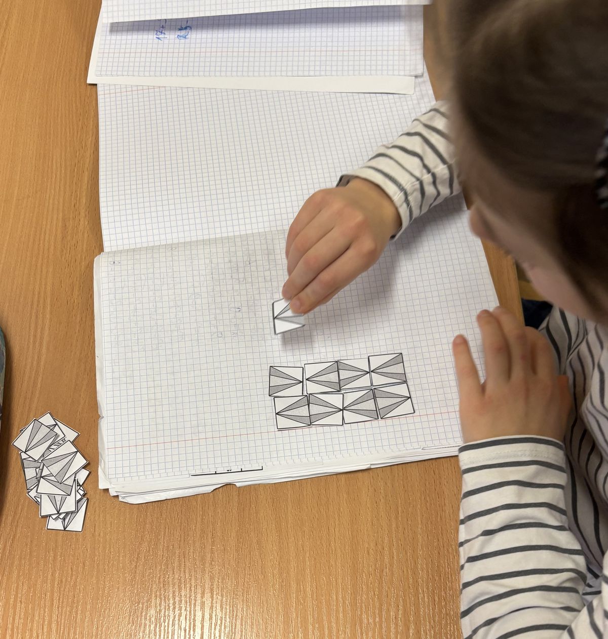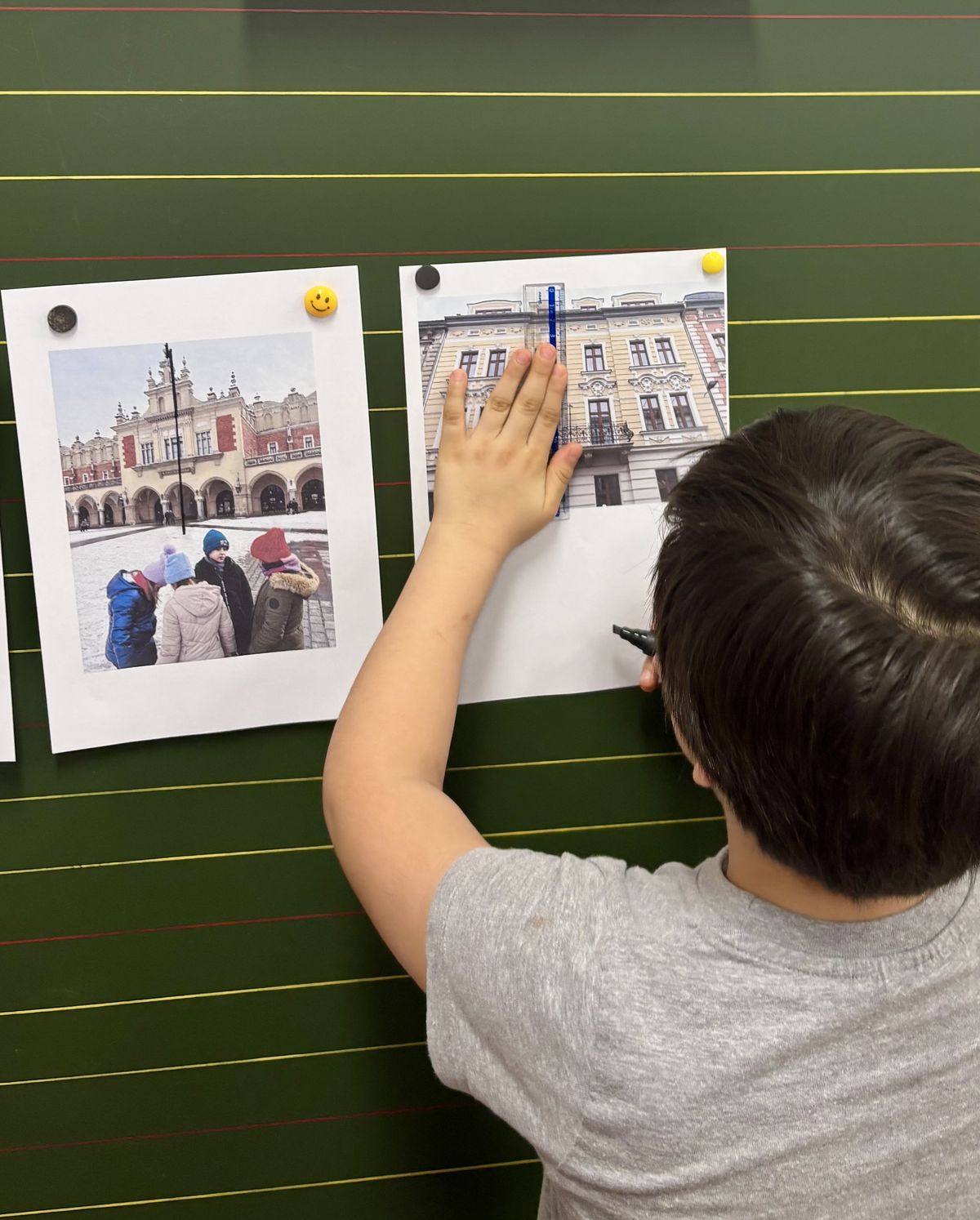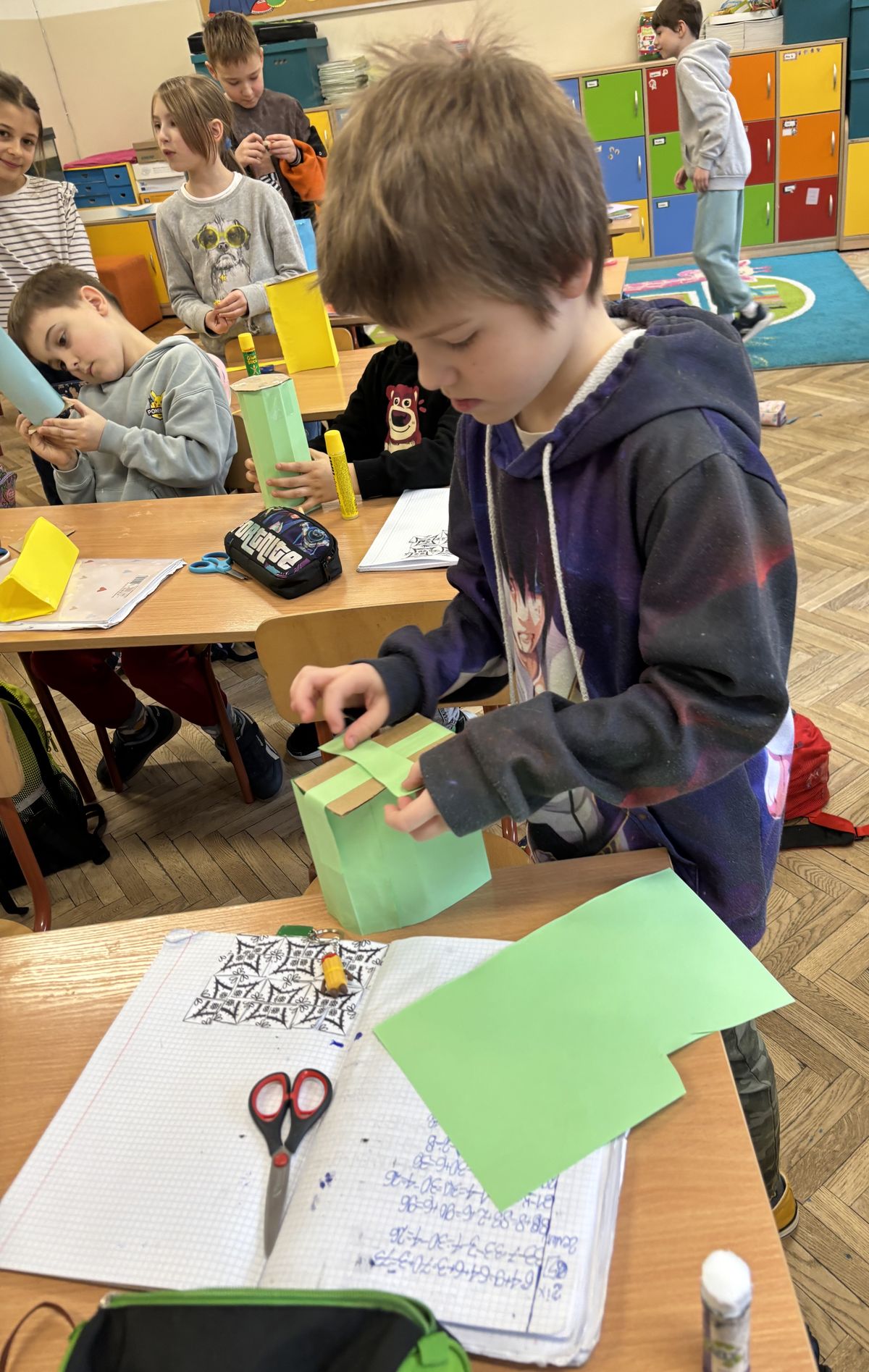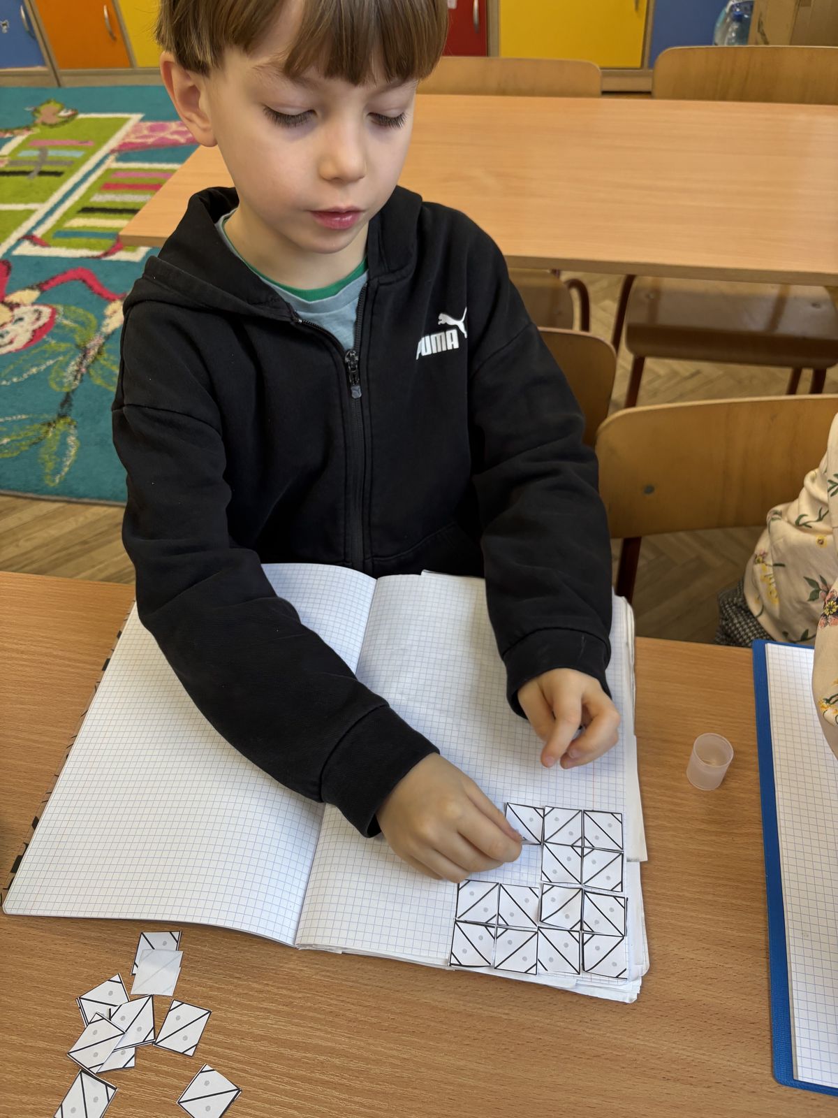 25 lutego dzieci z klasy II b zakończyły realizację kolejnego modułu projektu „Natalka i Antek w świecie Wielkiej Matematyki”. Tym razem w roli głównej wystąpiła architektura! W napotkanych podczas spaceru budowlach, uczniowie odkrywali różne bryły i kształty, powtarzające się na elewacjach płaskorzeźby i trójkątne tympanony, a na suficie w kinie, przepiękne drewniane kasetony. W klasie, dzieci wyznaczały oś symetrii budynków, a z małych papierowych kafelków, układały różnorodne parkietaże czyli mające zastosowanie na podłogach i ścianach powtarzające się, geometryczne wzory. Na planie koła, trójkąta, rozmaitych czworokątów i ośmiokąta skonstruowały własne budowle. Początki nie były łatwe, bo papier nie chciał dopasować się do podstawy. Ale w miarę upływu czasu, zaangażowanie i doświadczenie rosły, a upór, determinacja oraz wzajemna pomoc pozwoliły na ukończenie projektów. Spodobało się! Cztery osoby chcą zostać architektami!