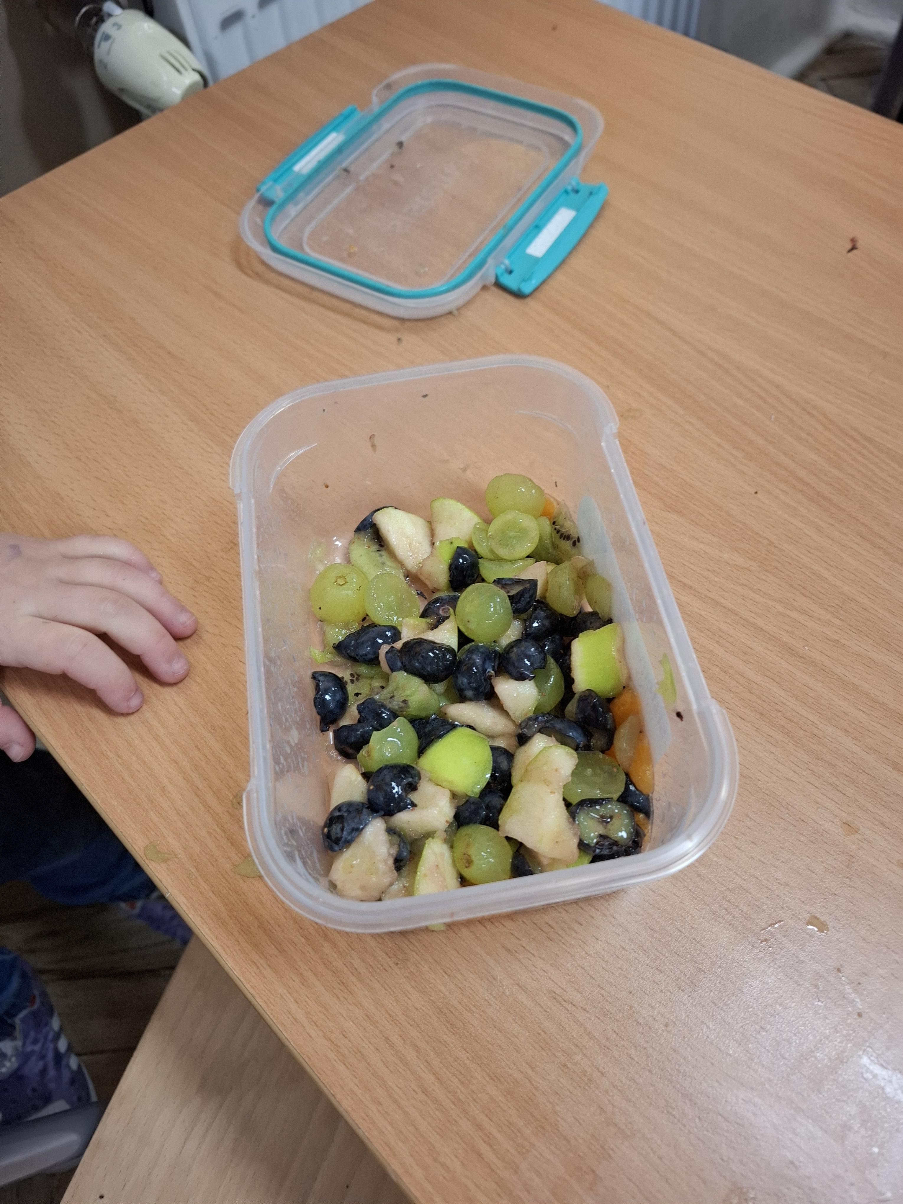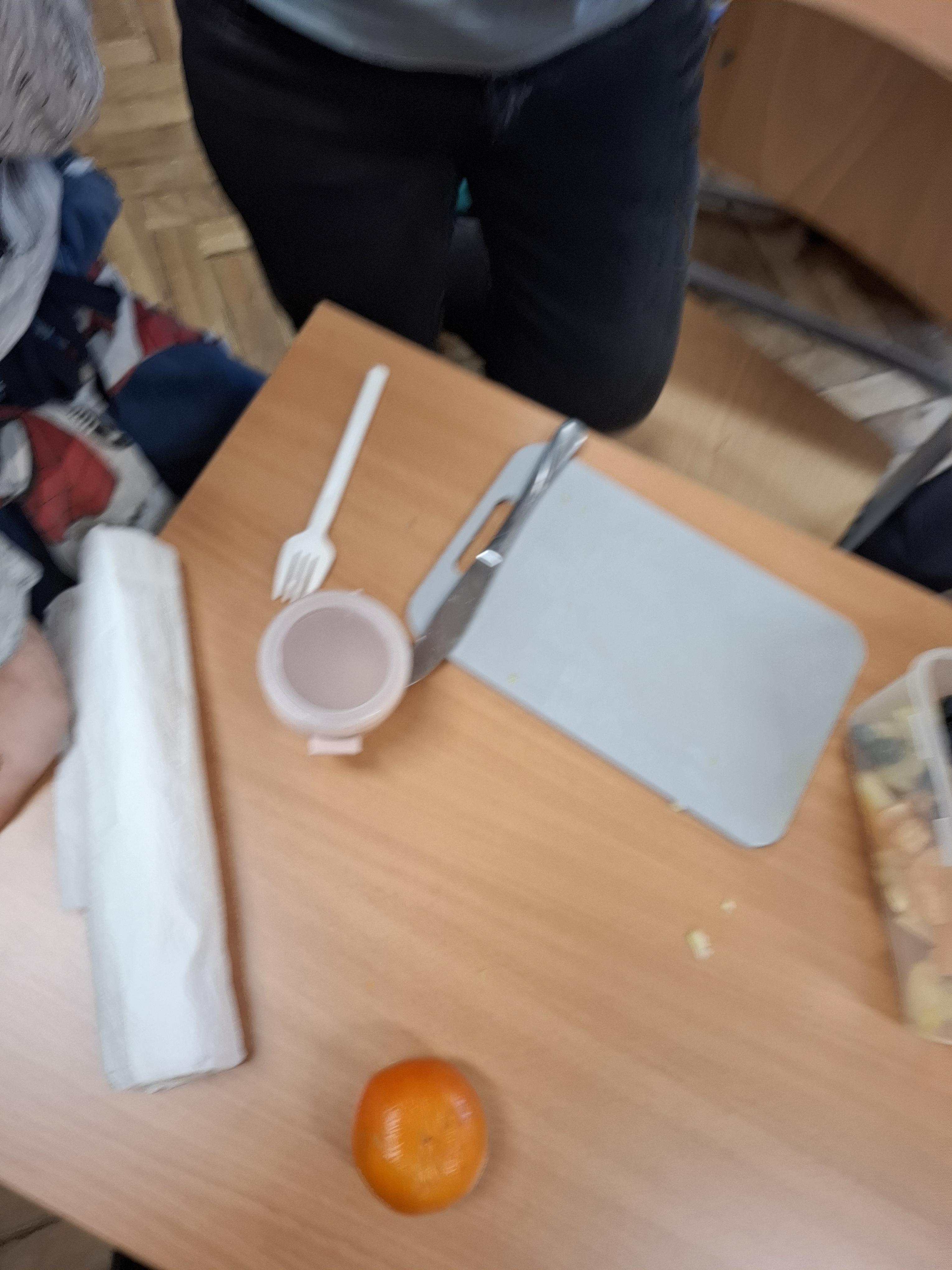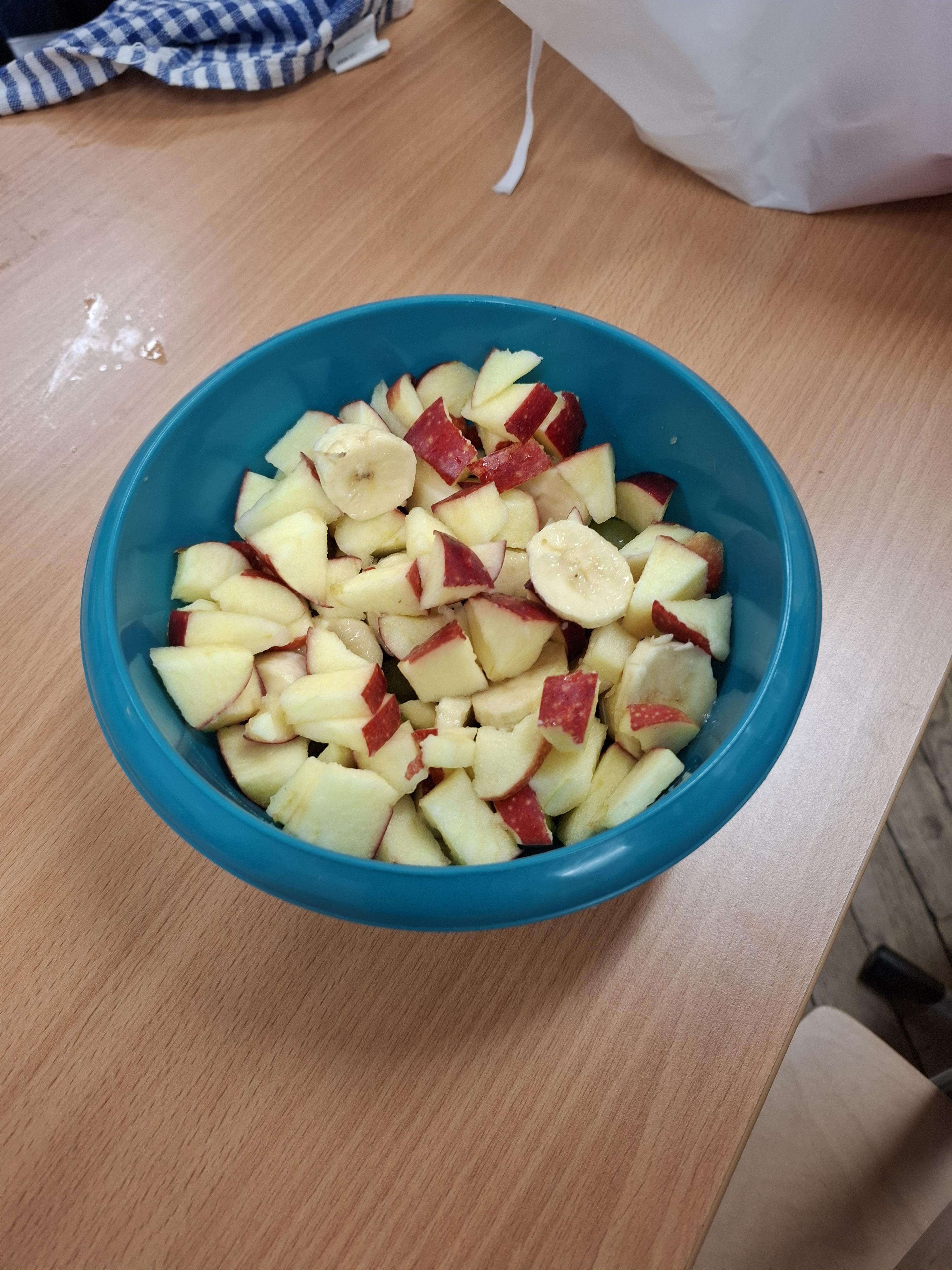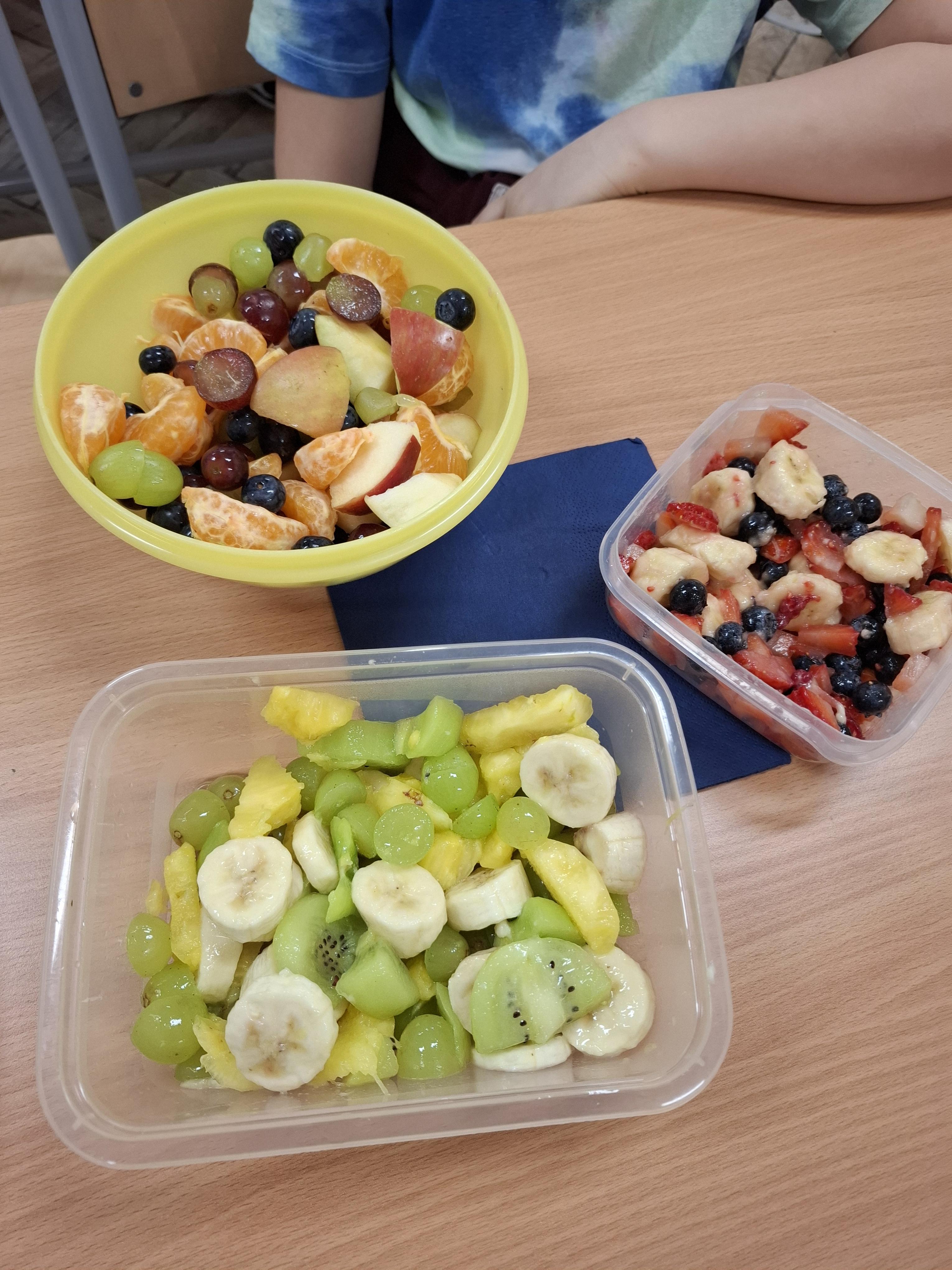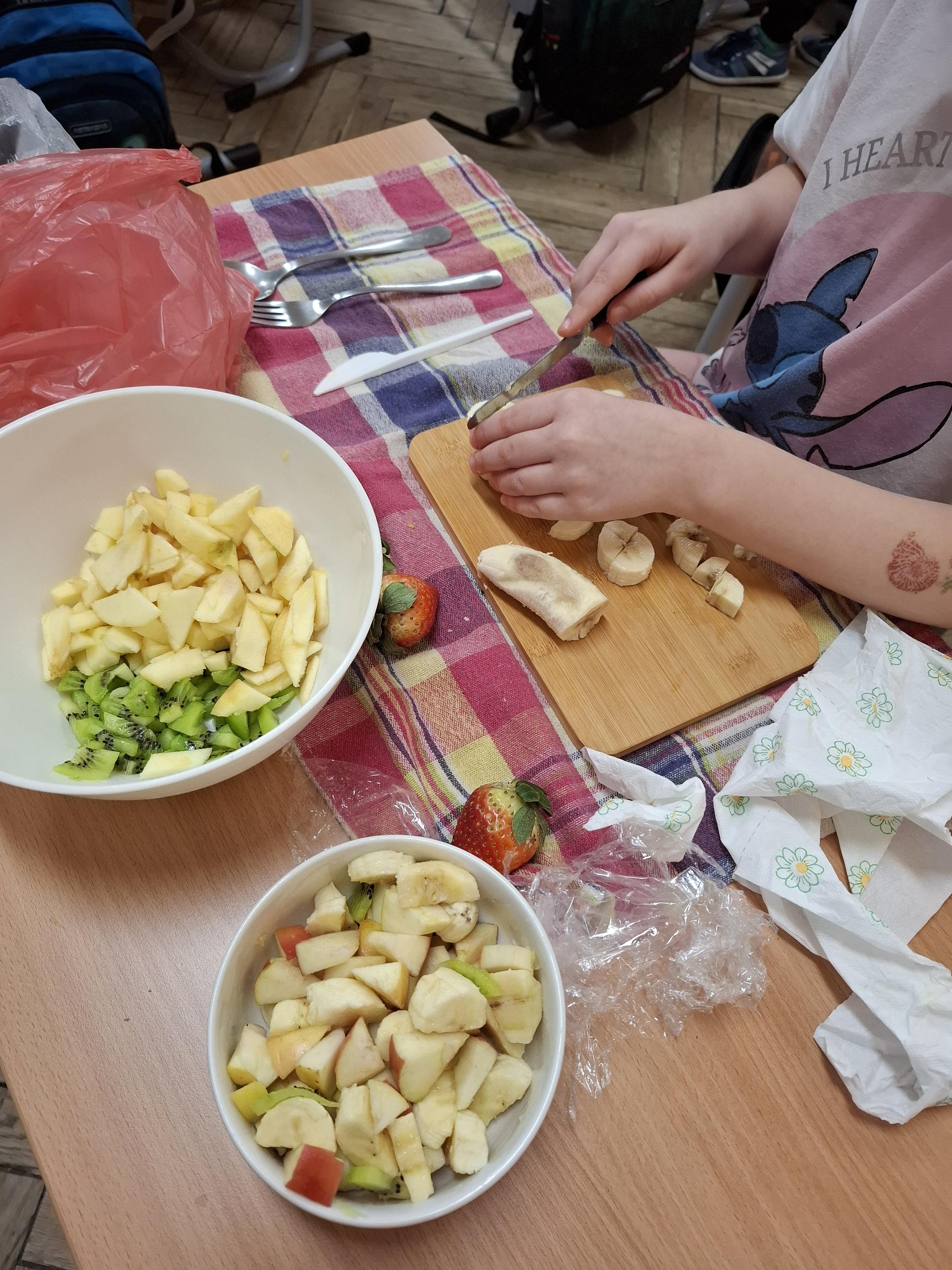 Klasa 1 a wybrała się tym razem szukać matematyki... w kuchni. Okazało się, że bardzo wiele kuchennych spraw jest związanych z obliczeniami: powierzchnia kuchni, ilość sprzętów i mebli, ilość wszelkiego rodzaju naczyń, sztućców i przyborów kuchennych, a co najważniejsze przepisy na różnorodne potrawy, które trzeba dodać w odpowiednich ilościach... W gramach, dekagramach, mililitrach czy litrach. No i na sztuki. Trzeba też wydać odpowiednią ilość pieniędzy, aby wszystkie składniki kupić. Tak więc kuchnia bez matematyki miałaby się "kiepsko". Kiedy już zostało ustalone, co łączy matematykę z kuchnią zarówno po burzy mózgów jak i obejrzanym filmie uczniowie rozwiązywali zadania z kart pracy. Największą radość sprawiła im własnoręcznie przygotowana sałatka owocowa z produktów, które przynieśli z domu. Dbając o zasady bhp przy korzystaniu z noży oraz oraz o higienę przy krojeniu owoców przygotowali sałatki z wykorzystaniem różnych, ulubionych owoców: bananów, jabłek, winogron, mandarynek, kiwi, truskawek i borówek . Mniam!