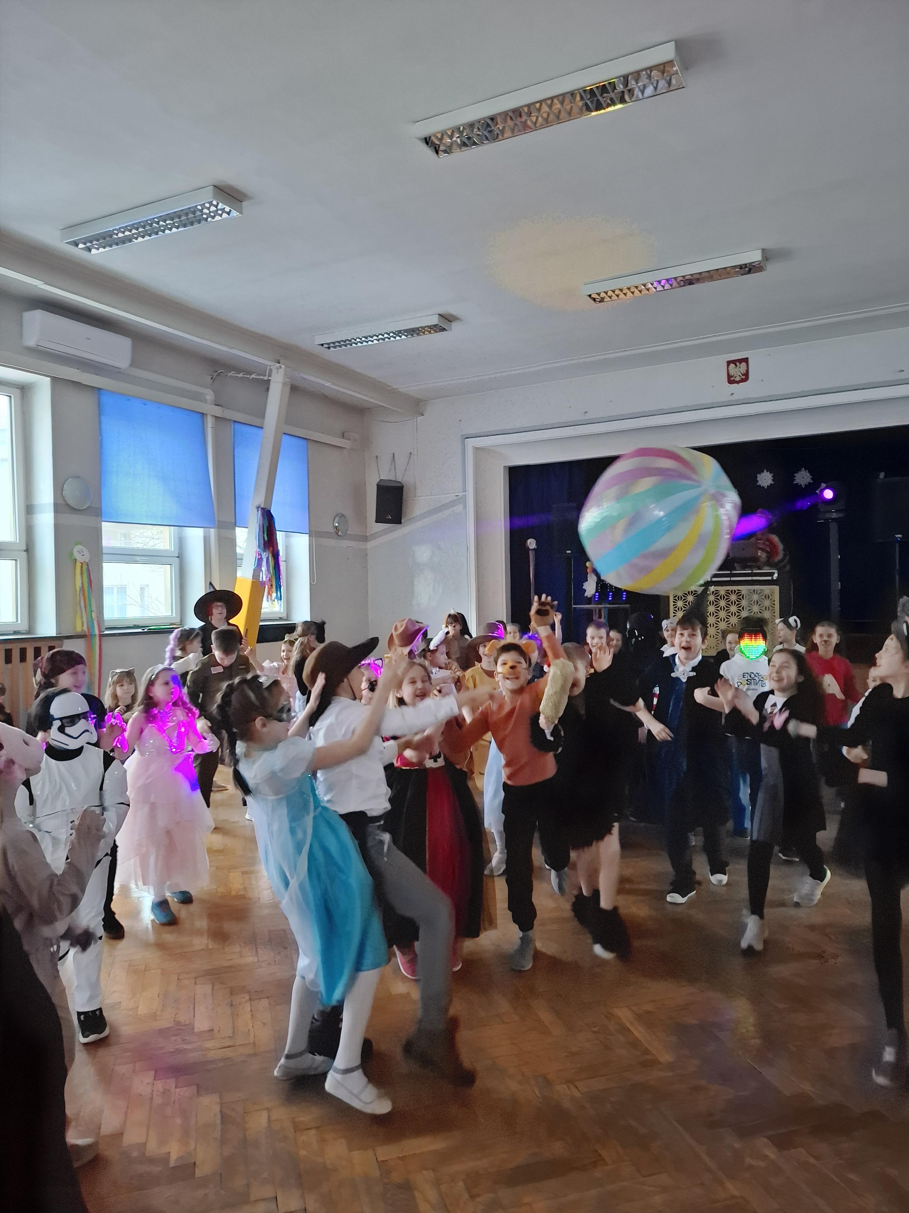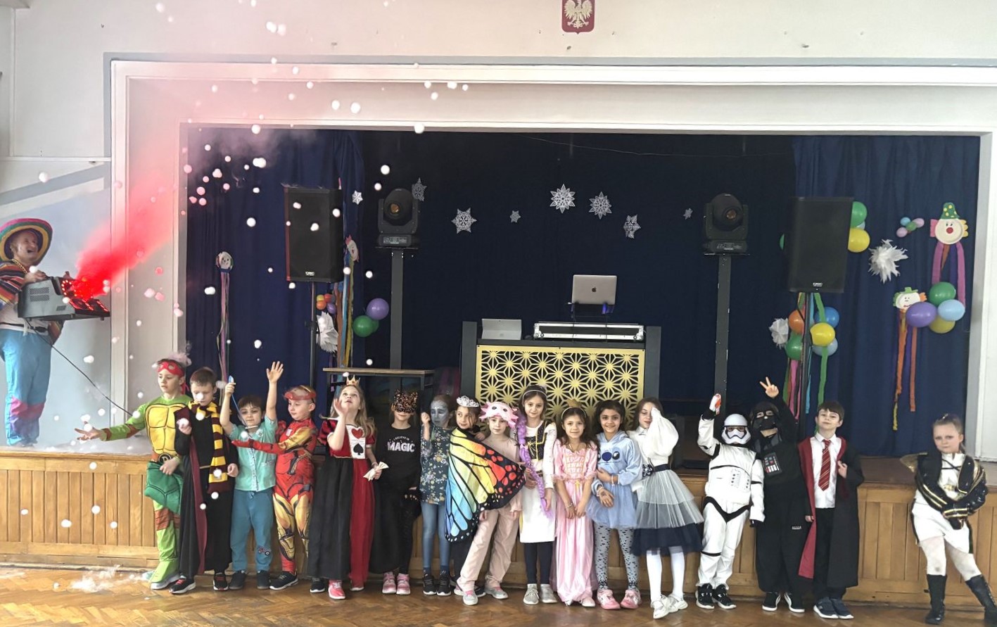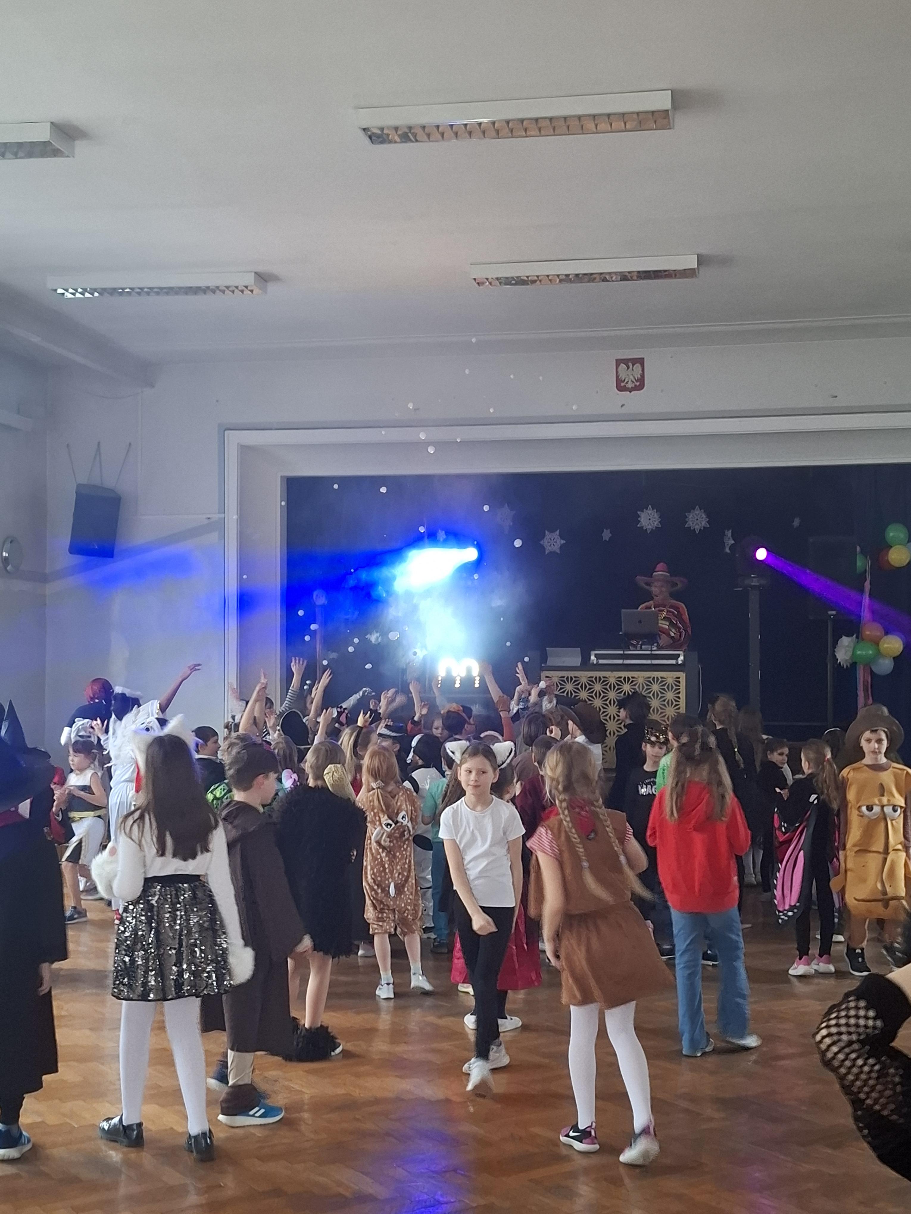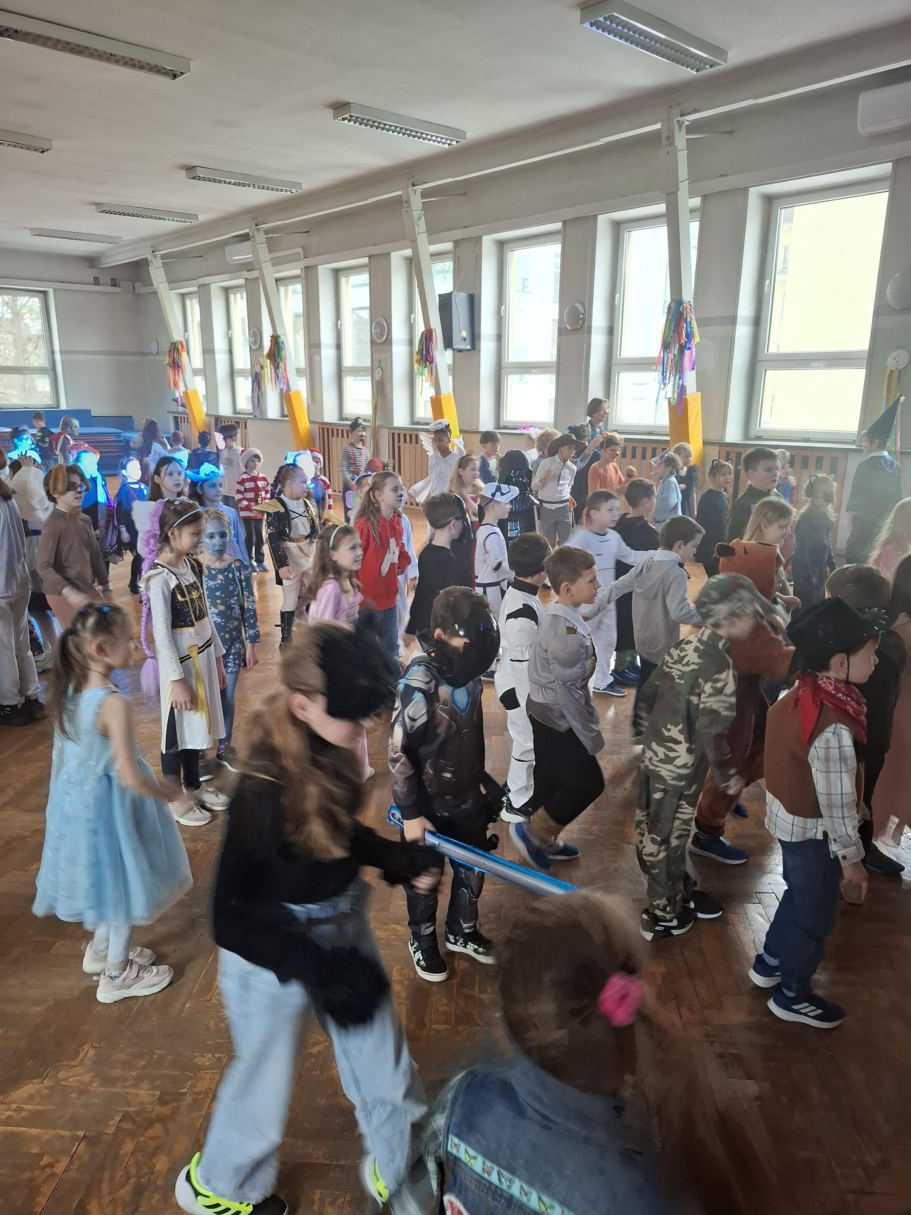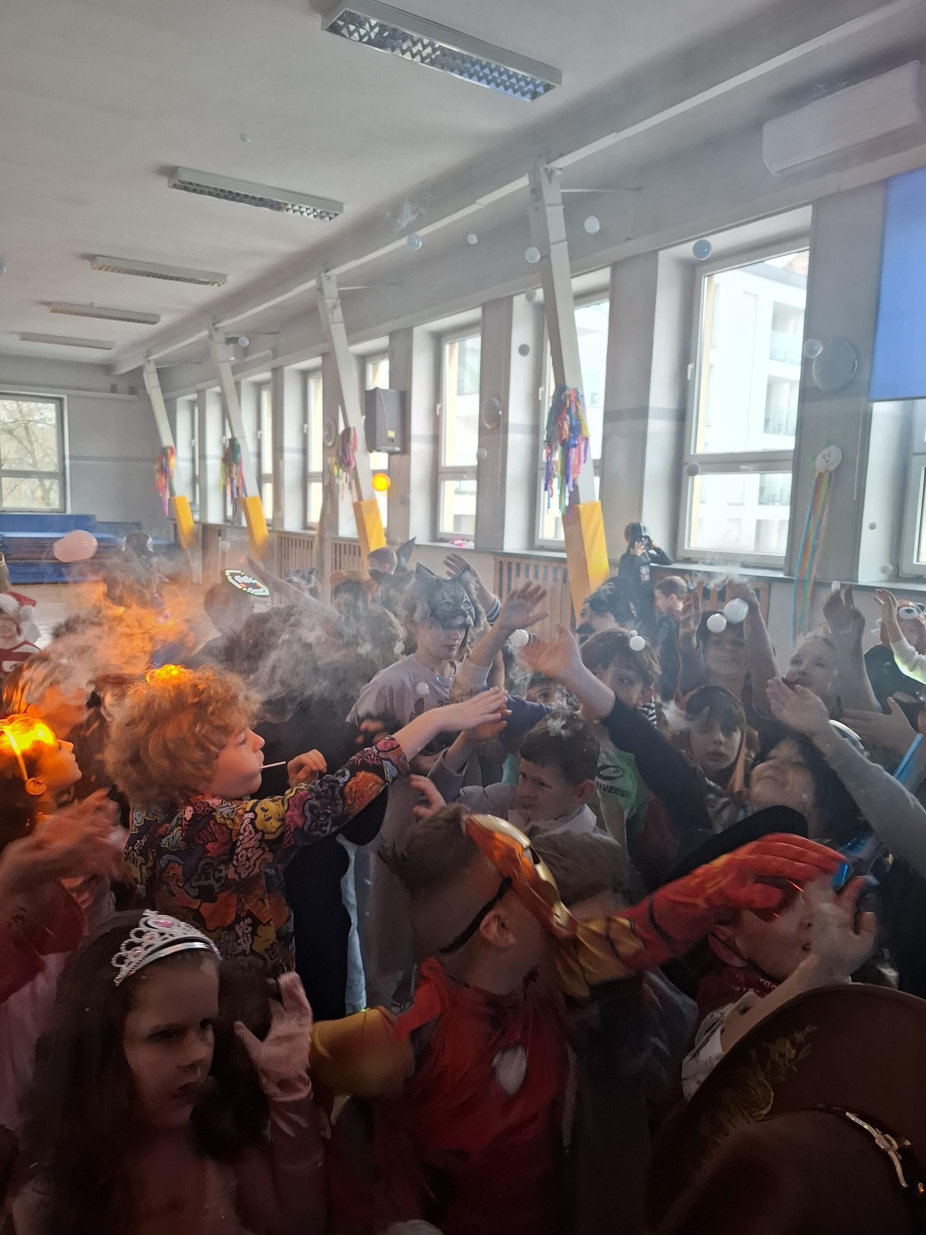 Bal karnawałowy dla uczniów klas 1–3 był wyjątkowym i radosnym wydarzeniem. Imprezę prowadził DJ, który od samego początku zadbał o świetną atmosferę i dobry kontakt z dziećmi. Żywiołowa muzyka dodawała wszystkim energii, a dodatkowo uczniowie mogli zgłaszać własne propozycje, co sprawiło im ogromną radość. Podczas balu nie zabrakło ciekawych zabaw ruchowych i tanecznych, w których brały udział wszystkie dzieci. Zachwyt wywoływały efekty specjalne, takie jak bańki mydlane oraz kolorowe światła, które dodały imprezie prawdziwie karnawałowego klimatu. Uczniowie bawili się znakomicie, uśmiech, energia i entuzjazm towarzyszyły im przez cały czas trwania balu. Zabawa była bardzo udana! Mamy nadzieję, że na długo pozostanie miłym wspomnieniem dla najmłodszych.