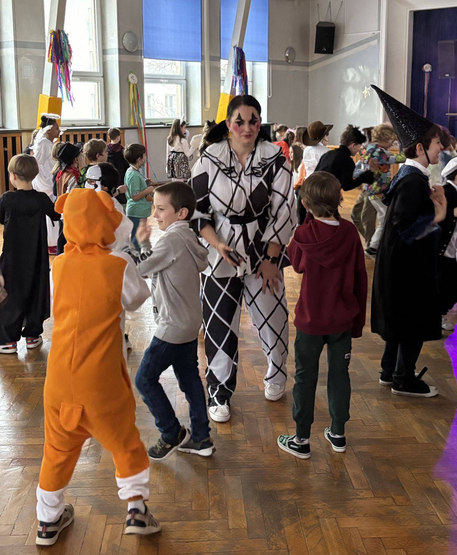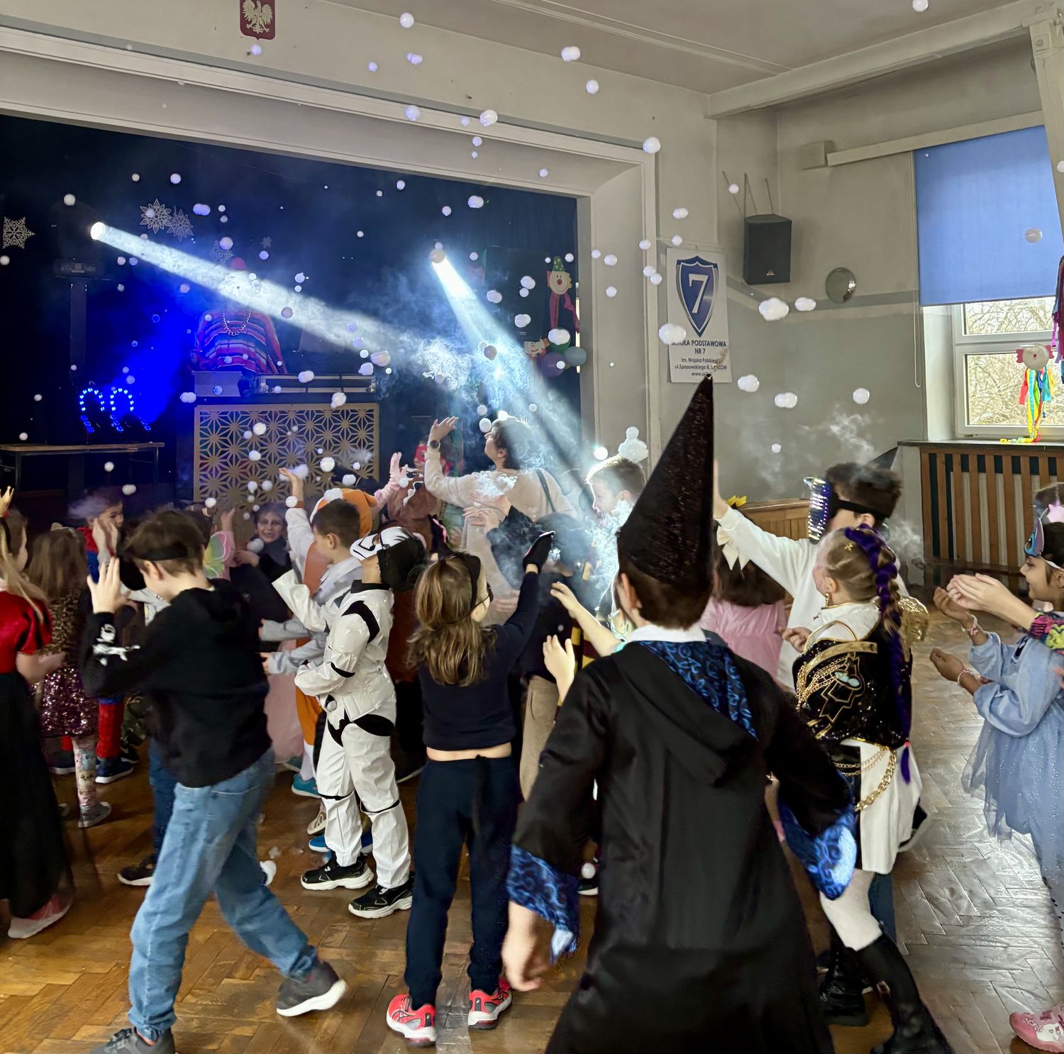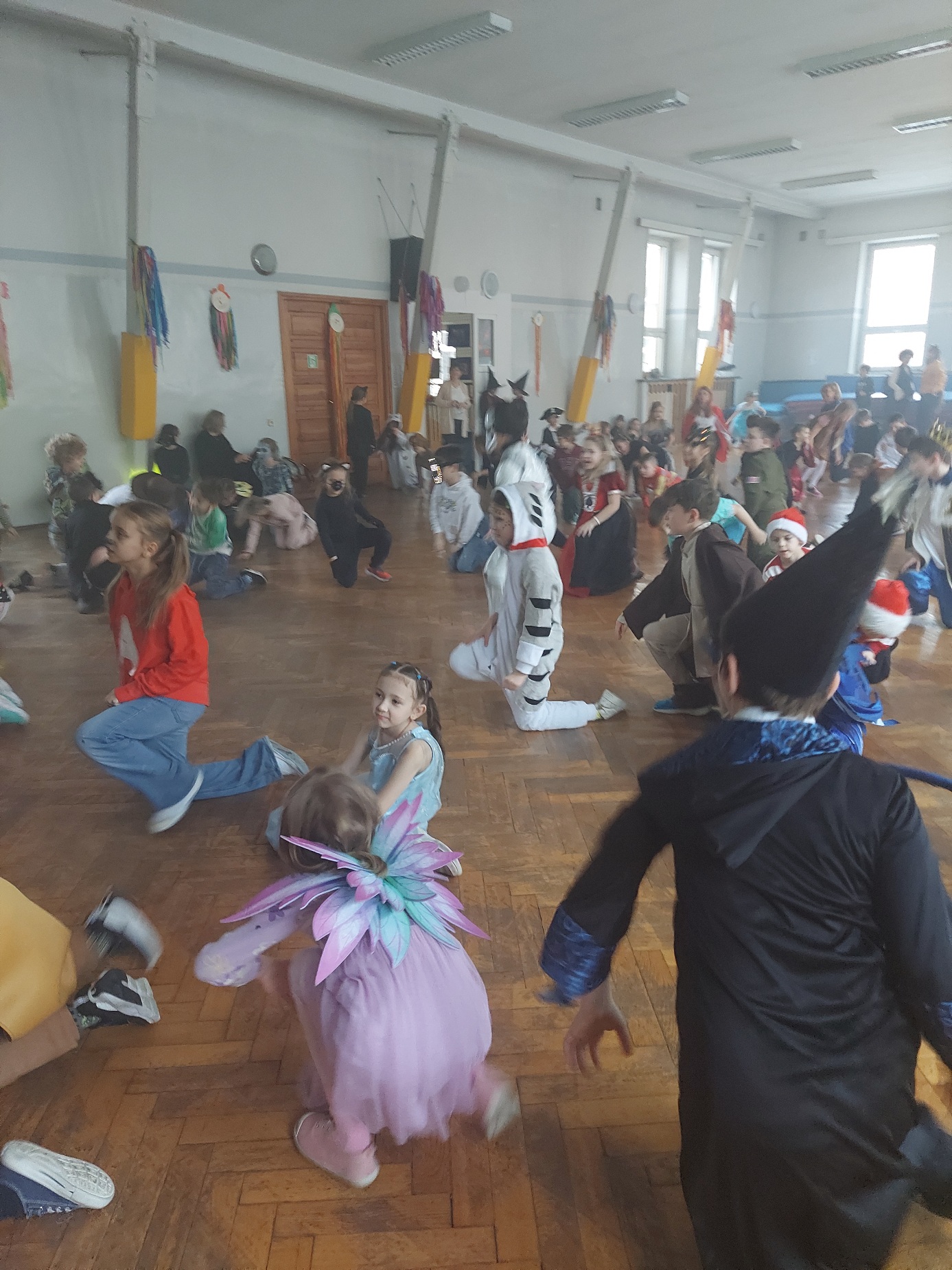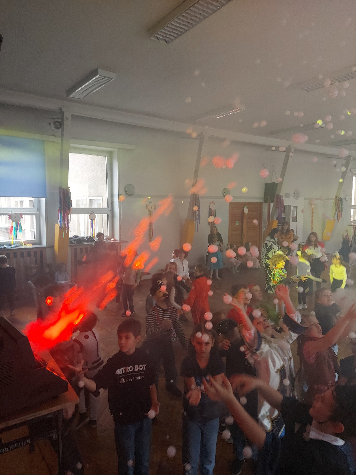 Bal karnawałowy dla uczniów klas 1–3 był wyjątkowym i radosnym wydarzeniem. Imprezę prowadził DJ, który od samego początku zadbał o świetną atmosferę i dobry kontakt z dziećmi. Żywiołowa muzyka dodawała wszystkim energii, a dodatkowo uczniowie mogli zgłaszać własne propozycje, co sprawiło im ogromną radość. Podczas balu nie zabrakło ciekawych zabaw ruchowych i tanecznych, w których brały udział wszystkie dzieci. Zachwyt wywoływały efekty specjalne, takie jak bańki mydlane oraz kolorowe światła, które dodały imprezie prawdziwie karnawałowego klimatu. Uczniowie bawili się znakomicie, uśmiech, energia i entuzjazm towarzyszyły im przez cały czas trwania balu. Zabawa była bardzo udana! Mamy nadzieję, że na długo pozostanie miłym wspomnieniem dla najmłodszych.