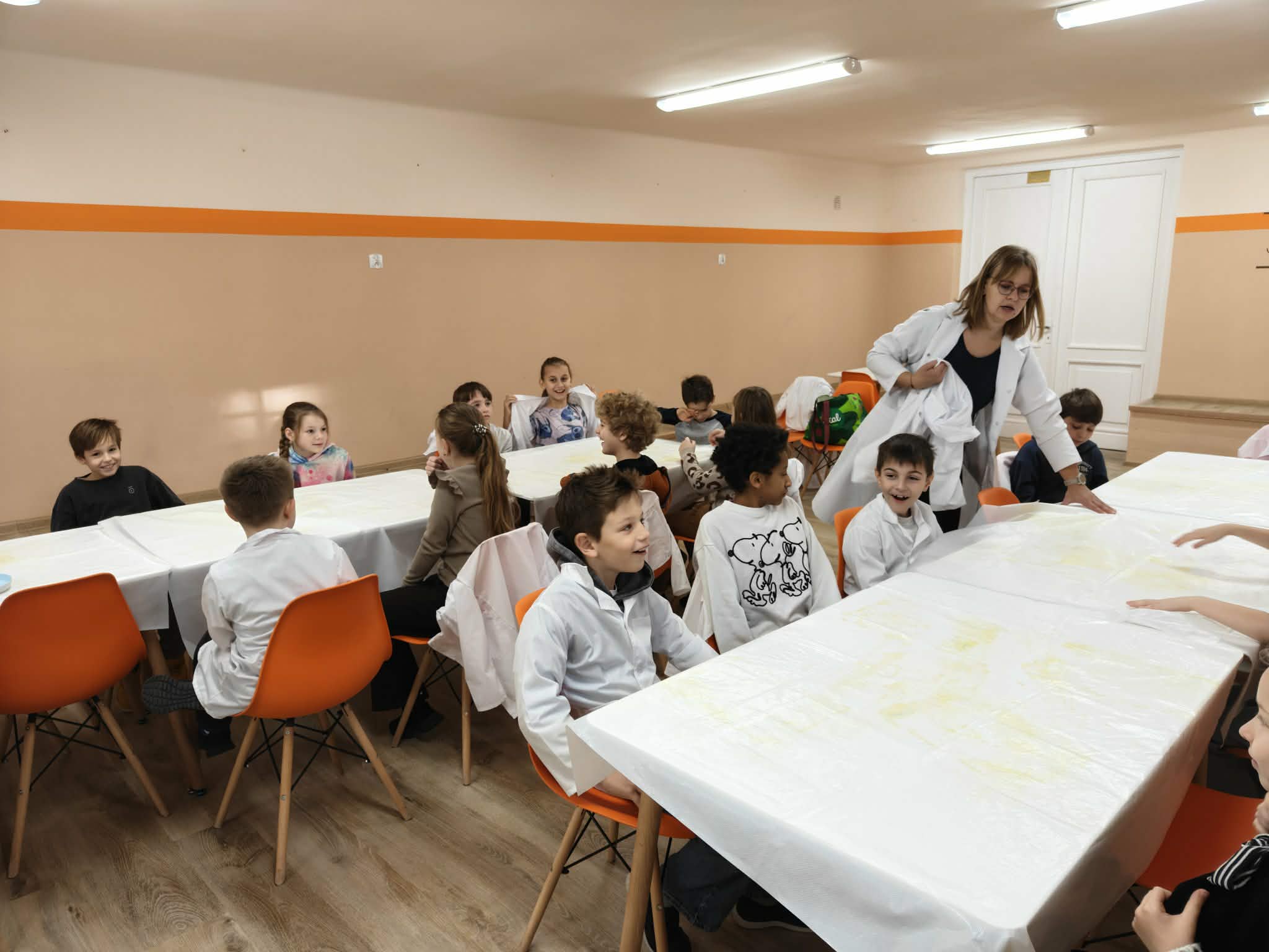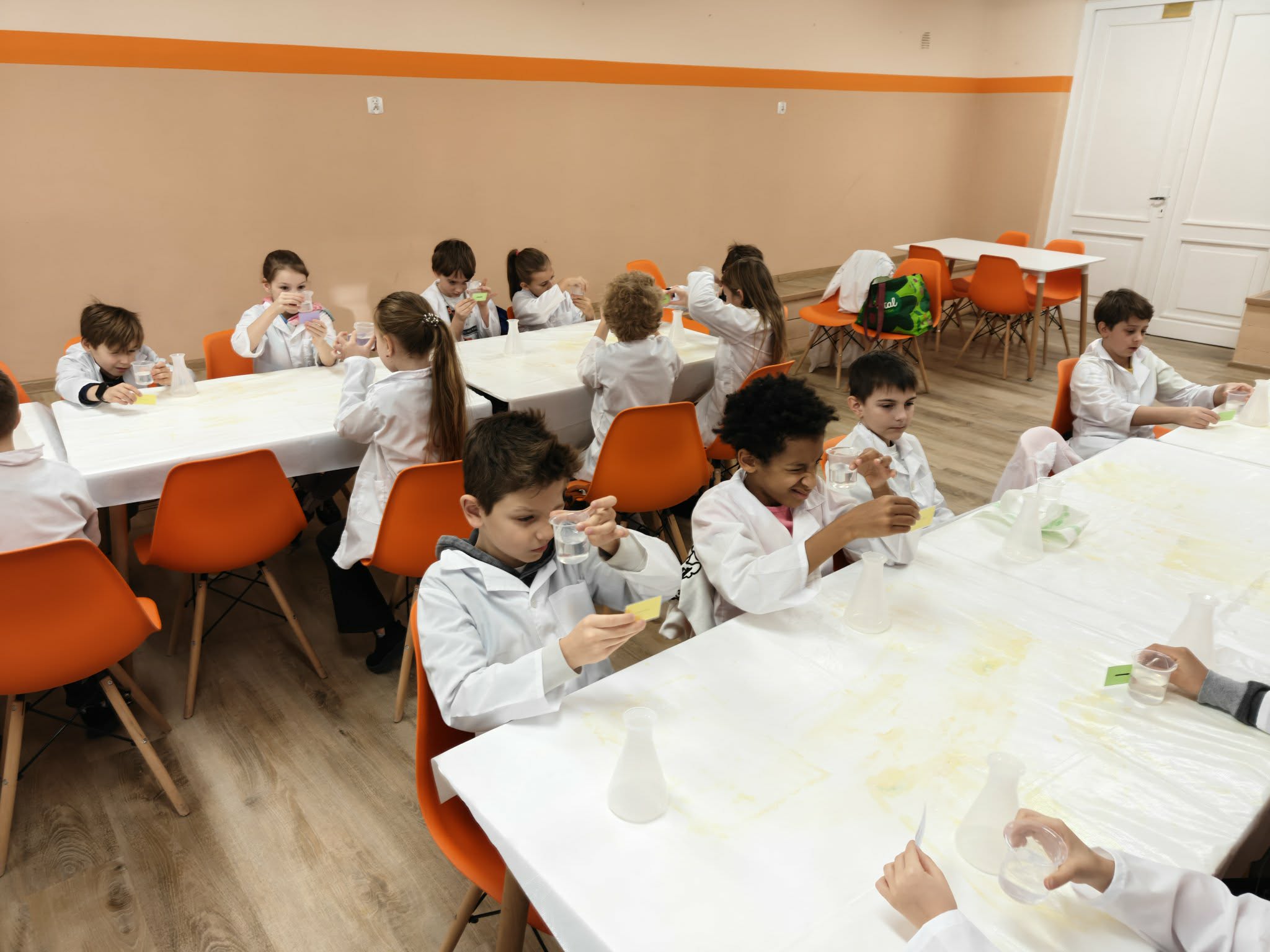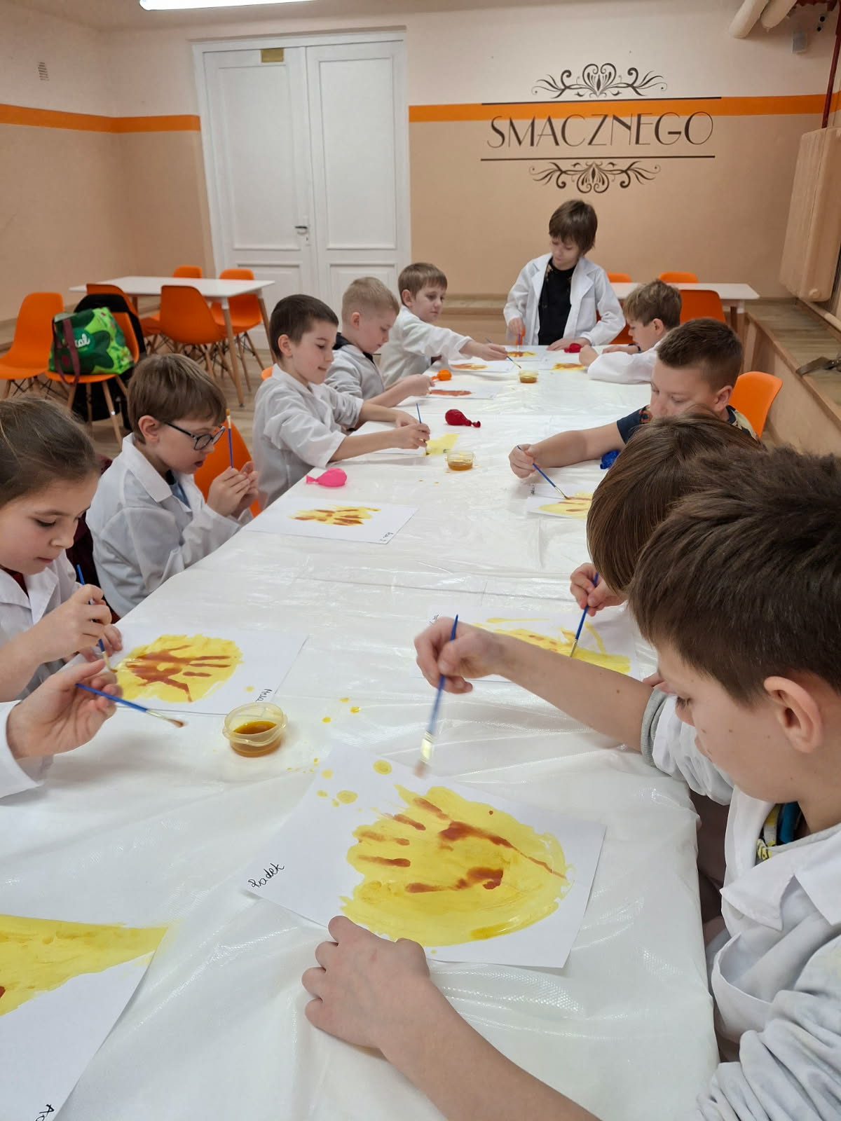 W grudniu, dzieci z klas I-III, wzięły udział w warsztatach chemicznych pt." Psoty- nie ma - jest". Pani prowadząca zajęcia wytłumaczyła na początku zasady udziału: nie dotykamy rękami ust i oczu, zachowujemy spokój i słuchamy poleceń. następnie każdy uczeń otrzymał biały fartuch ochronny. Pierwsze doświadczenie dotyczyły atramentu i zachowania jego koloru w wodzie zimnej i ciepłej. otóż w ciepłej natychmiast wrócił jej naturalny kolor, a w zimnej nadal był to kolor granatowy. Do ciepłej został dodany ocet i na końcu zajęć okazało się, że w zimnej po 45 minutach wrócił kolor przeźroczysty, a do wody kwaśnej kolor granatowy. Kolejne doświadczenie to złudzenie optyczne- na lizakach, którymi dzieci szybko obracały były pary obrazków: ptaszek i klatka, jeździec i koń oraz rybka i akwarium. Ludzkie oko nie jest w stanie tak szybko przetwarzać obrazu więc widzieliśmy ptaszka w klatce, jeźdźca na koniu i rybkę w akwarium. z wodnych kuleczek i balonu każdy zrobił dla siebie gniotka, a dzięki wodzie z sodą, w której na początku zajęć każdy odbił na kartce swój mokry odcisk, pomalowana po kilkunastu minutach wodą zabawioną kurkumą "dała" czerwono-brązowy odcisk dłoni.