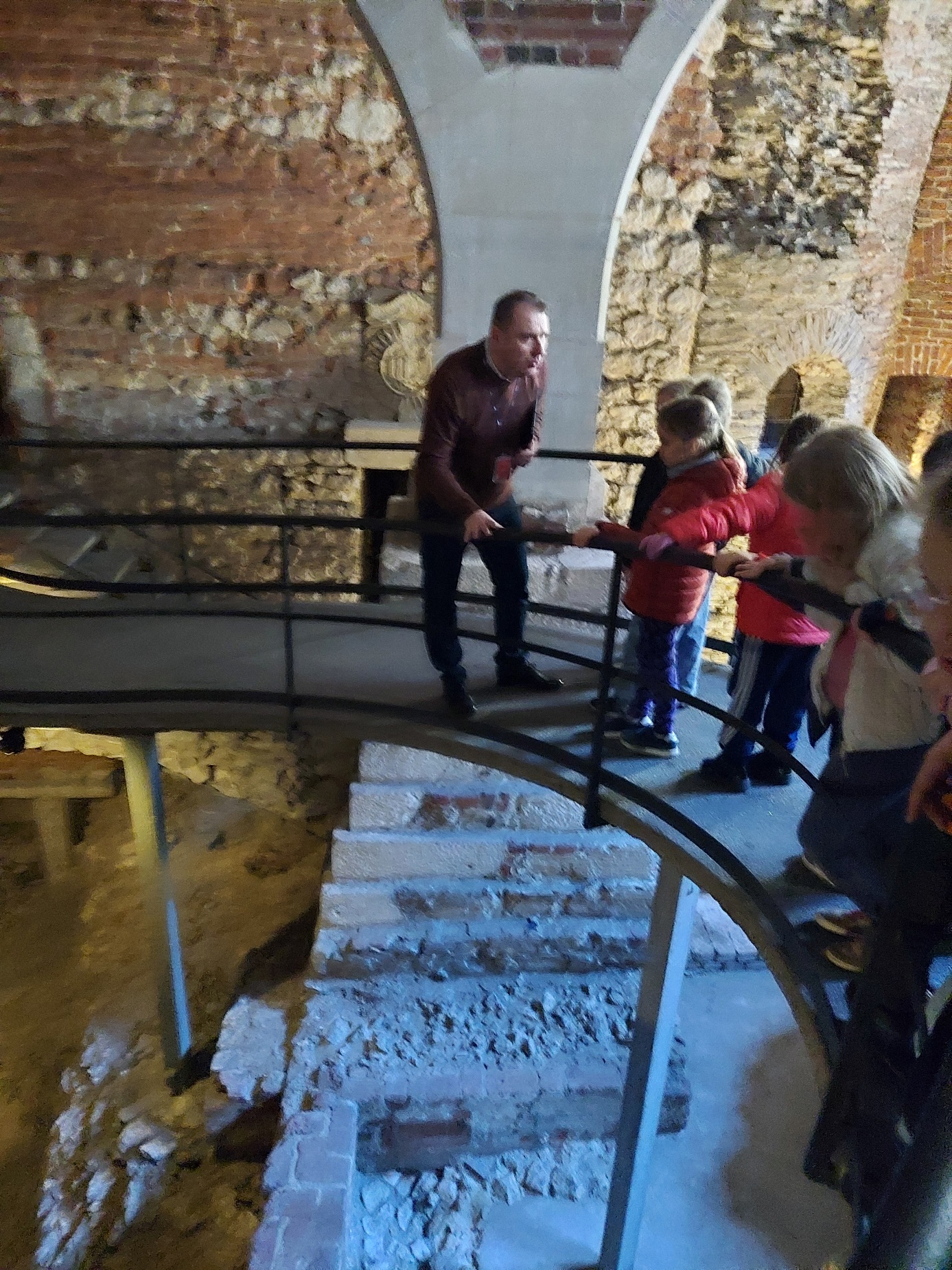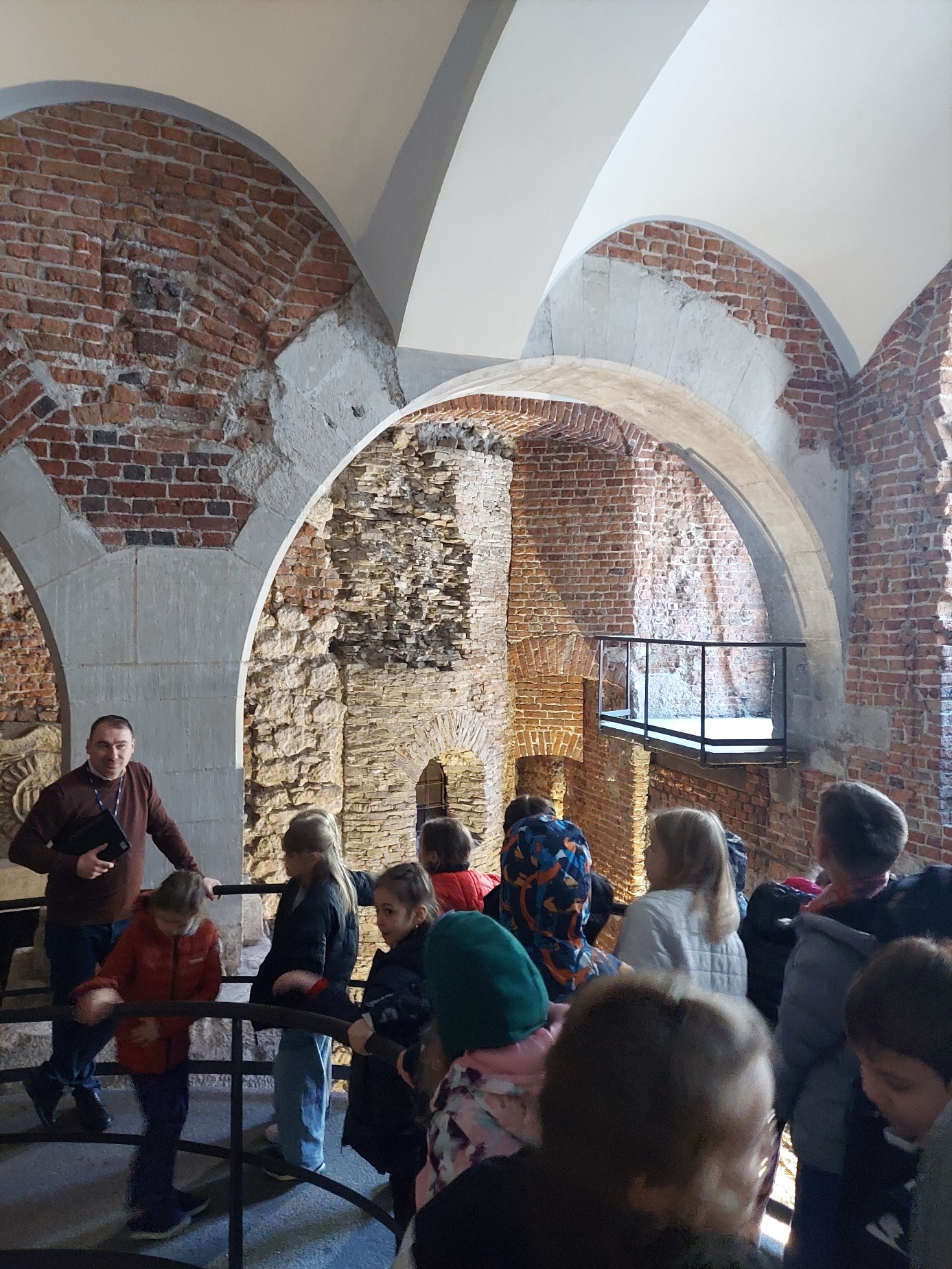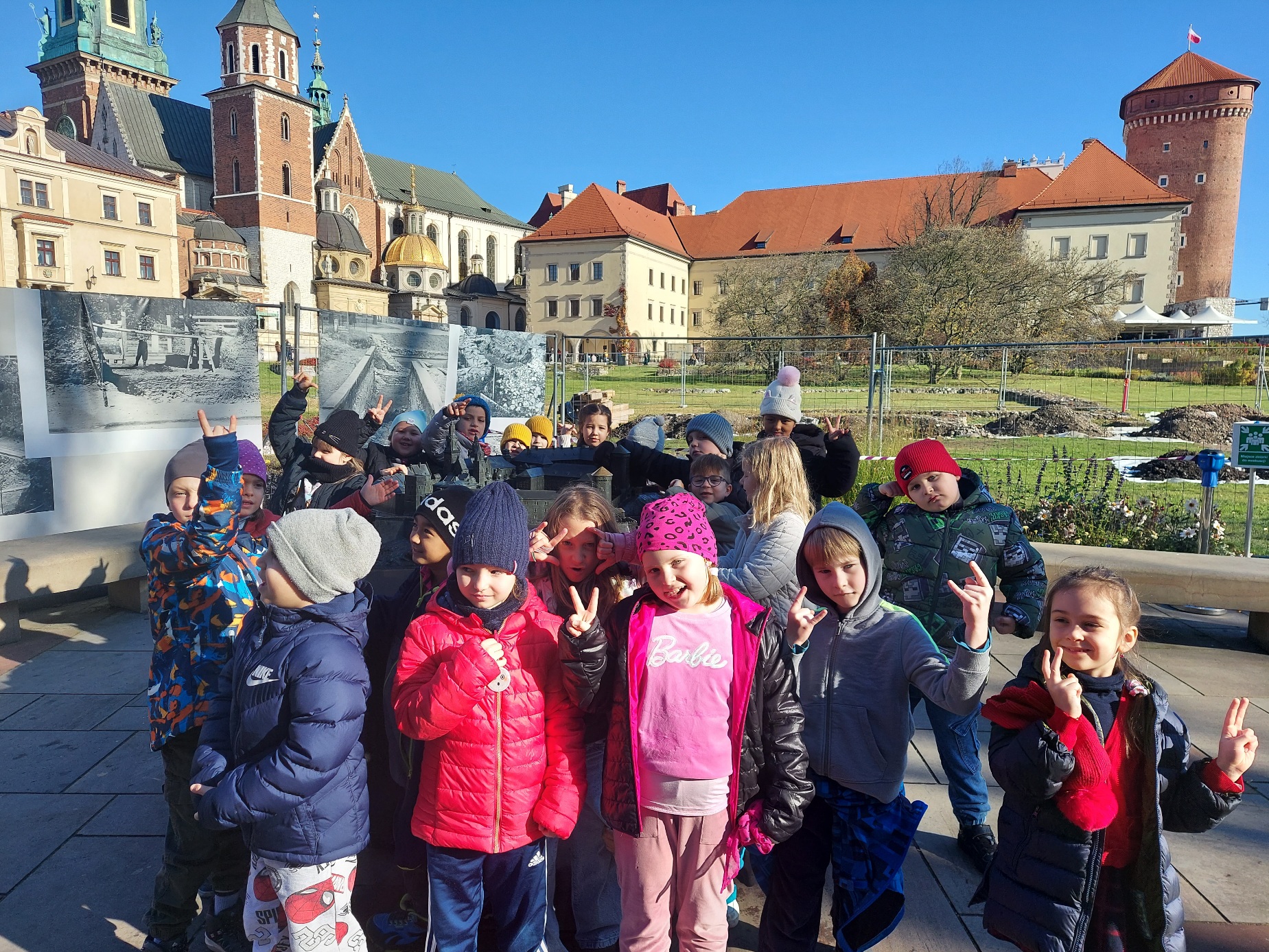 Uczniowie klasy 1b wybrali się na Zamek Wawelski i odbyli podróż w odległe czasy, poznając historię wawelskiego wzgórza. Dzięki pracy archeologów Wawel nie zaginął, ale został odkopany i pokazany zwiedzającym. Na trasie zwiedzania uczniowie zobaczyli najstarszą w Polsce przedromańską, kamienną budowlę, czyli Rotundę św. Feliksa i Adaukta. Interesujący był zbiór kafli z pieców, które znajdowały się w komnatach królewskich. W miejscu kuchni królewskiej można było oglądać oryginalną, ceglaną posadzkę. Liczne wykopaliska archeologiczne umieszczone zostały w gablotach. Wśród niezwykłych eksponatów były żelazne nożyczki, biżuteria, drewniane łyżwy ,grzebienie, igły do szycia, gliniane garnki, zabawki, buty o bardzo małych rozmiarach. Dzieci mogły także obserwować pracę archeologów, którzy aktualnie pracują na wzgórzu wawelskim. Szukają śladów kościołów pod wezwaniem św. Michała i św. Jerzego. Odkrywanie tajemnic nieznanego Wawelu okazało się ciekawą lekcją historii.
